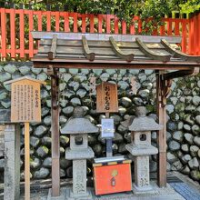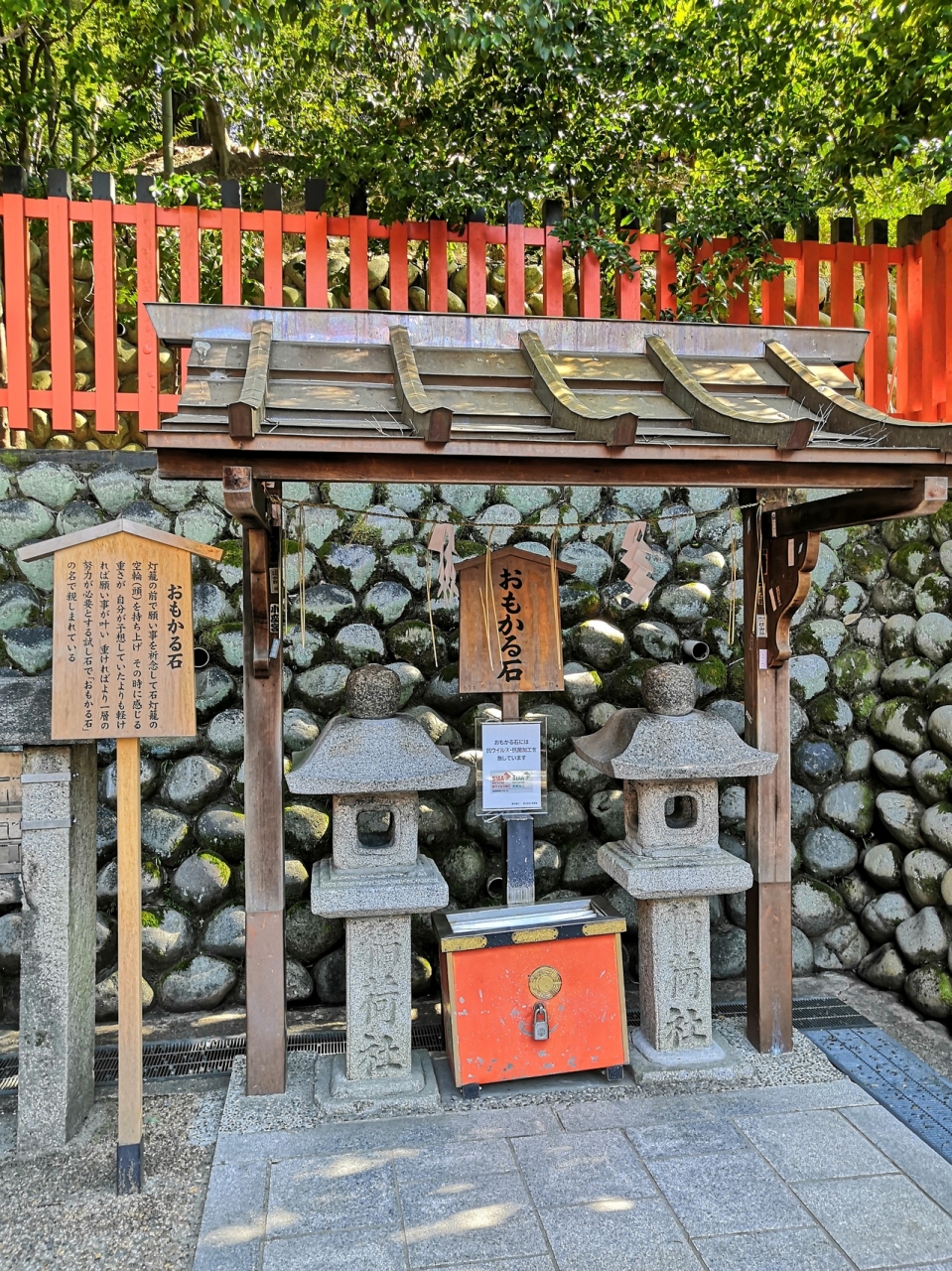 横に説明書きの看板があるのでわかりますが、まず灯篭の前で願い事をして、そのあと灯篭の上に置いてある丸い石を持ちあげた際にその重さが自分が予想したよりも軽いと願いが叶うということです。漢字で重軽石と書いた方がイメージつかめるかも。