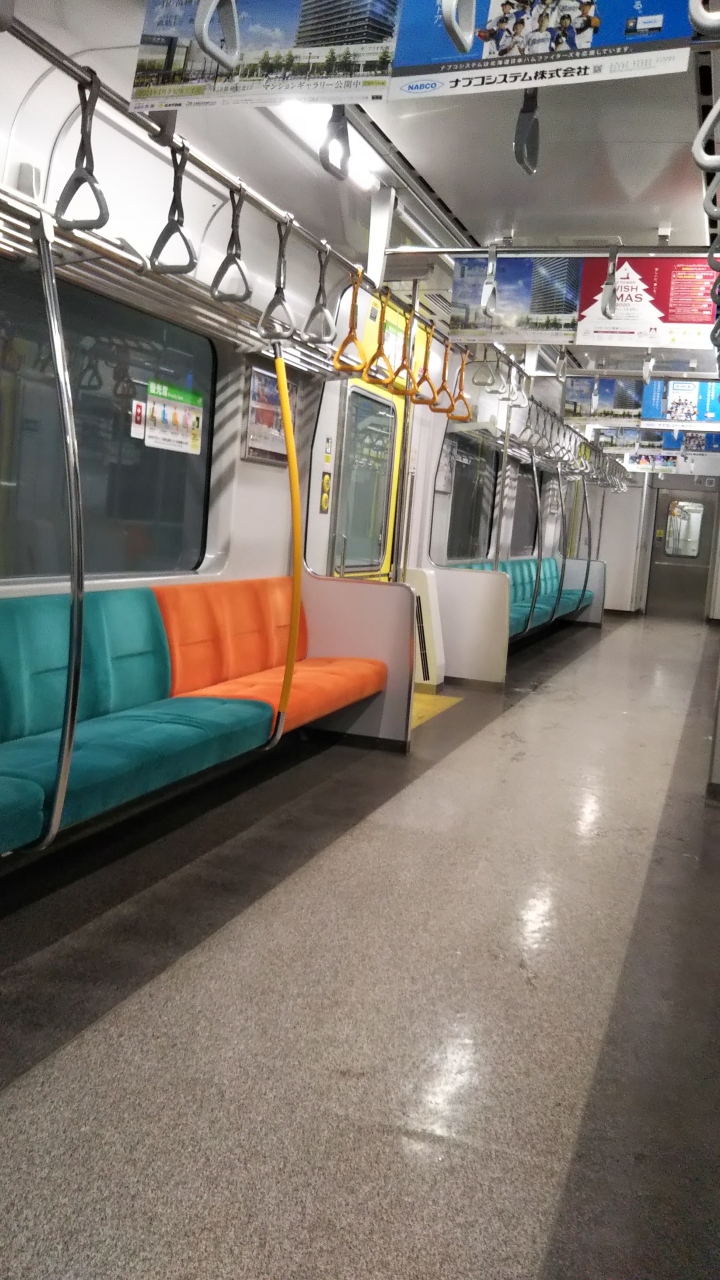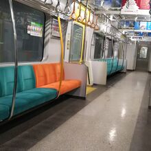 車両は横長シートで、基本緑シート。優先席はオレンジで、乗降口は黄色。
