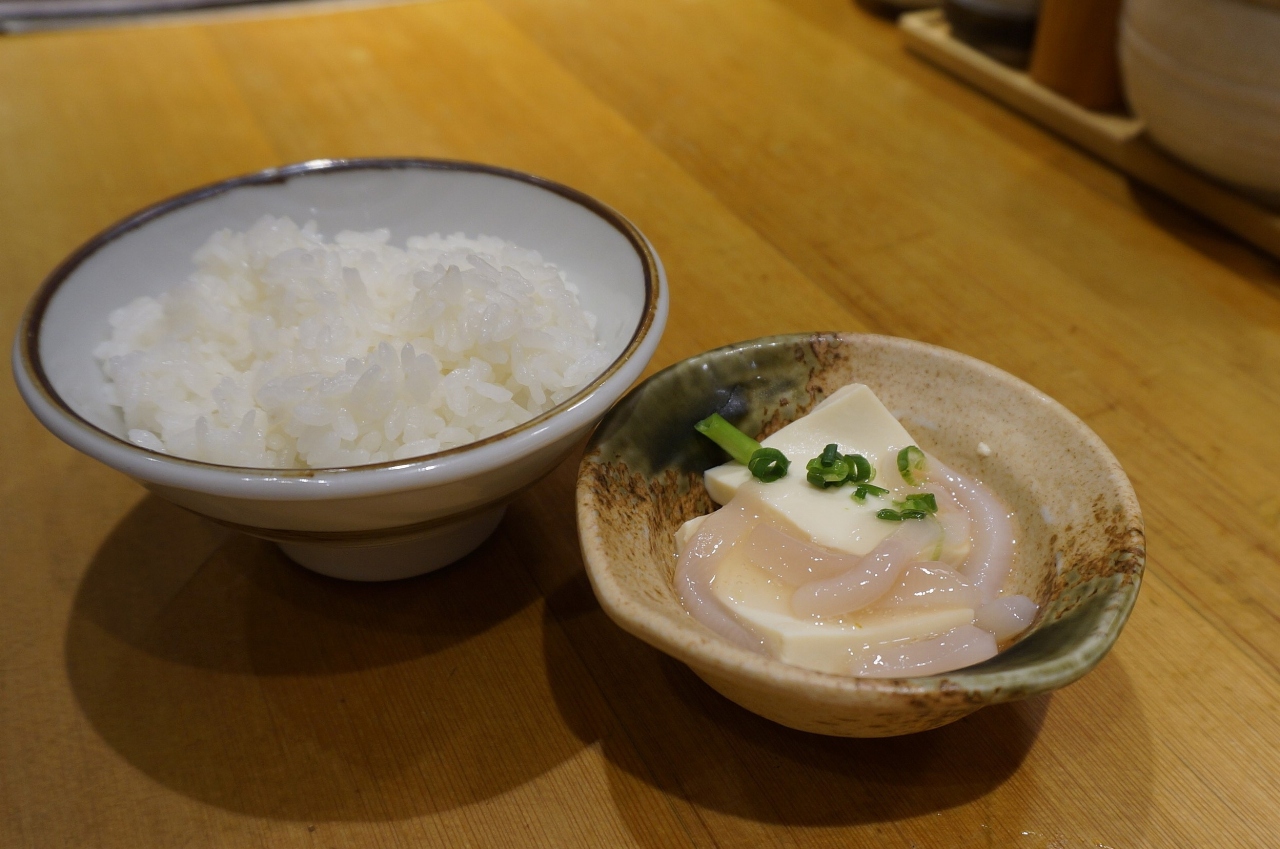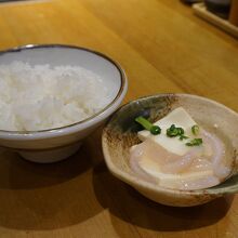 お塩と天つゆと大根おろし、ご飯と小鉢が出てきます。