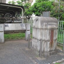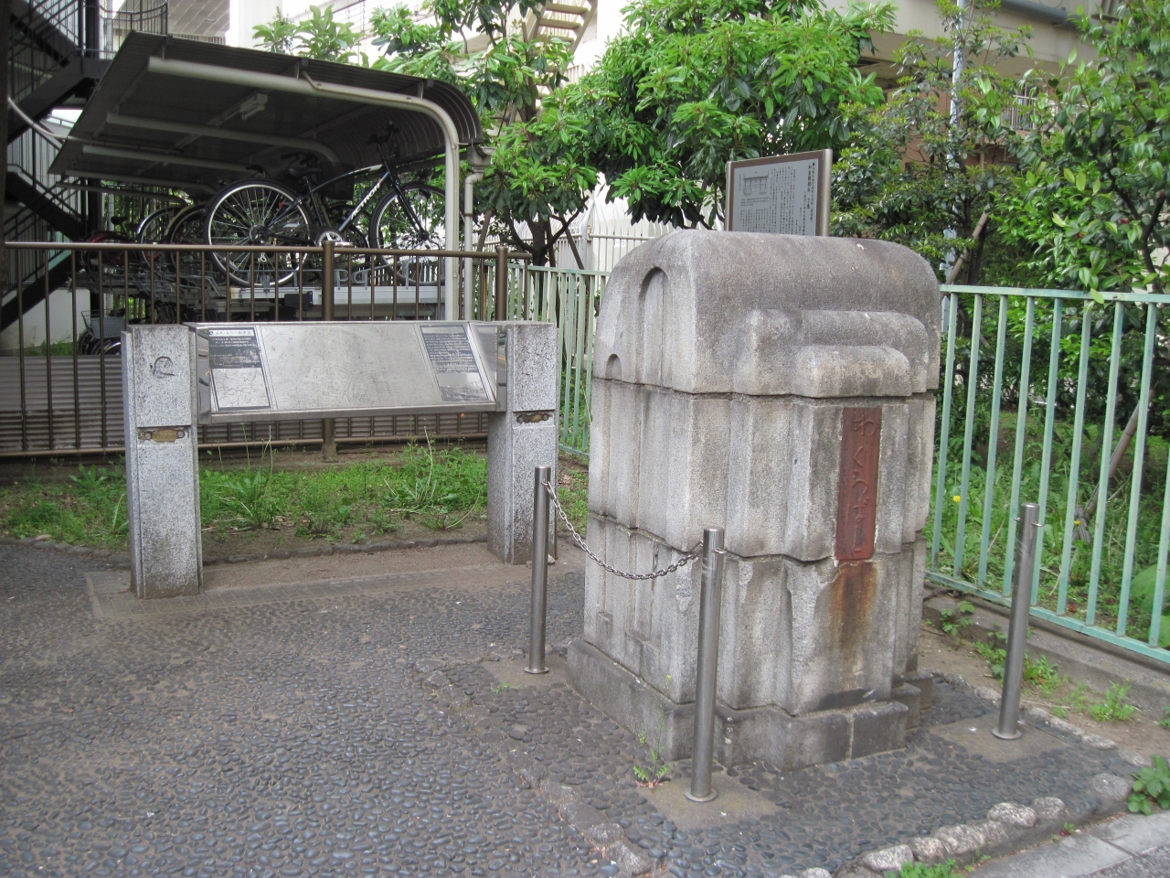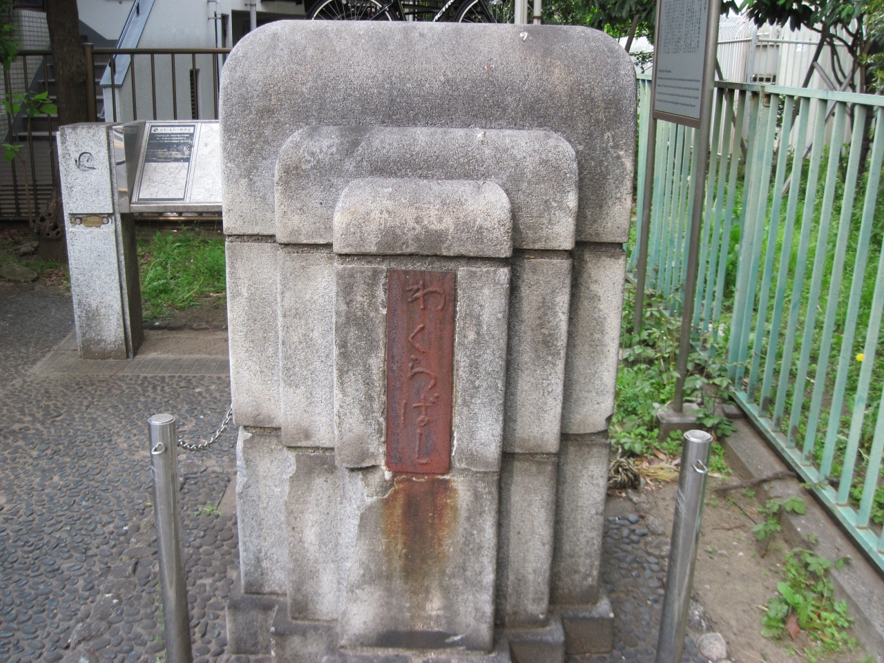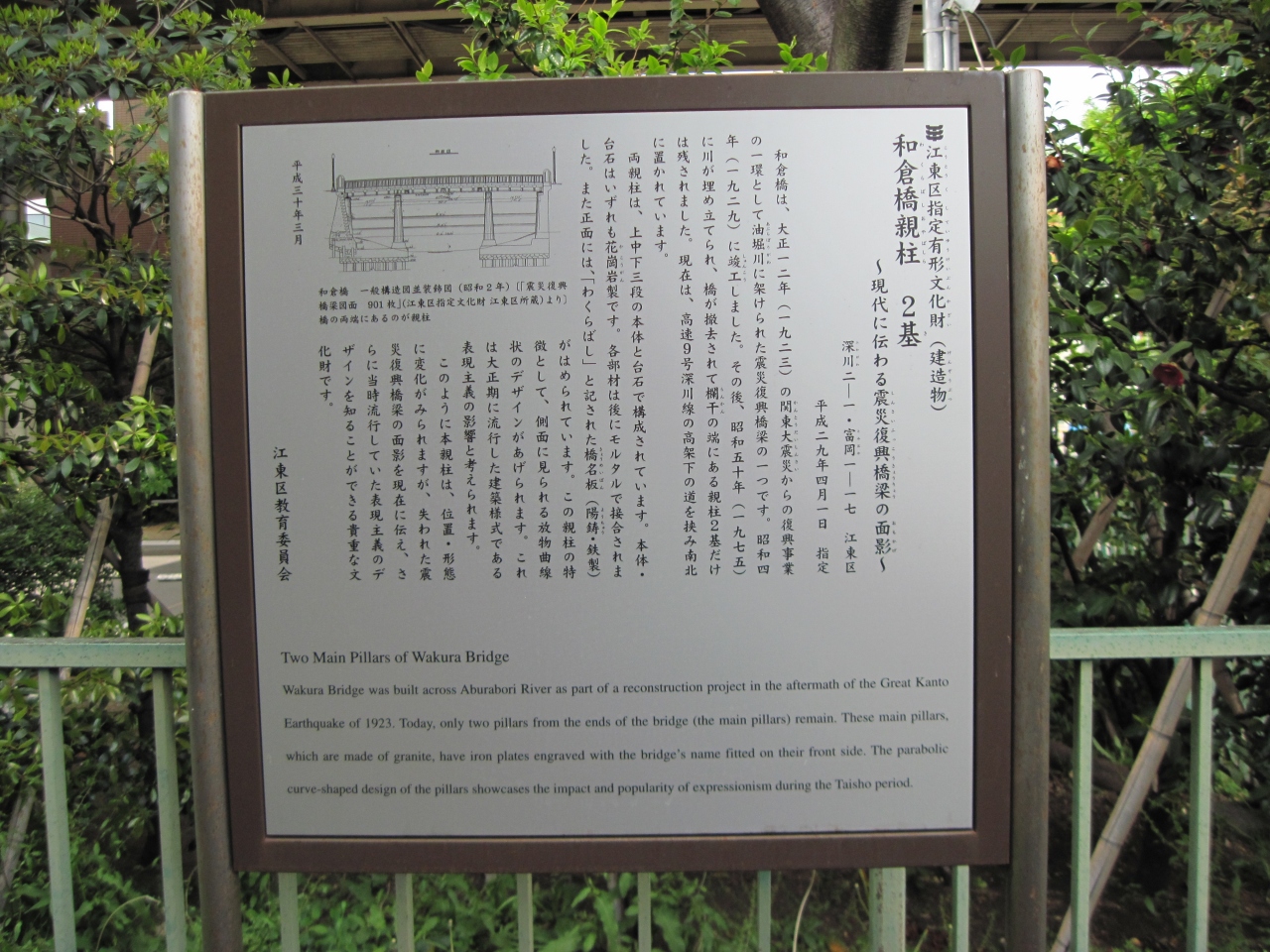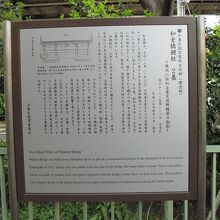 大理石でしょうか、どっしりとした橋の親柱だけが残されていました。今は川もなくなってしまったので、当時の橋を想像することはできませんが、そばの案内表示には、かろうじて橋の図面らしき絵が描いてあったので、昔の名残を感じました。