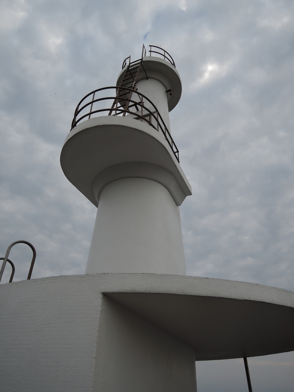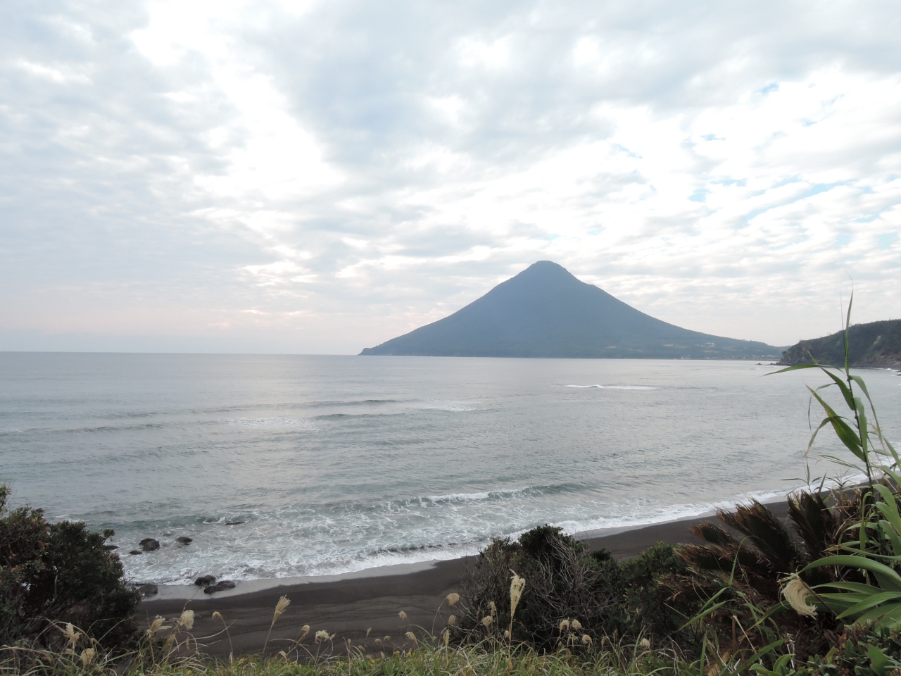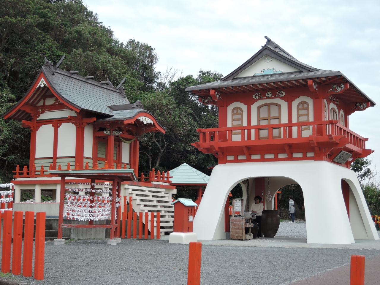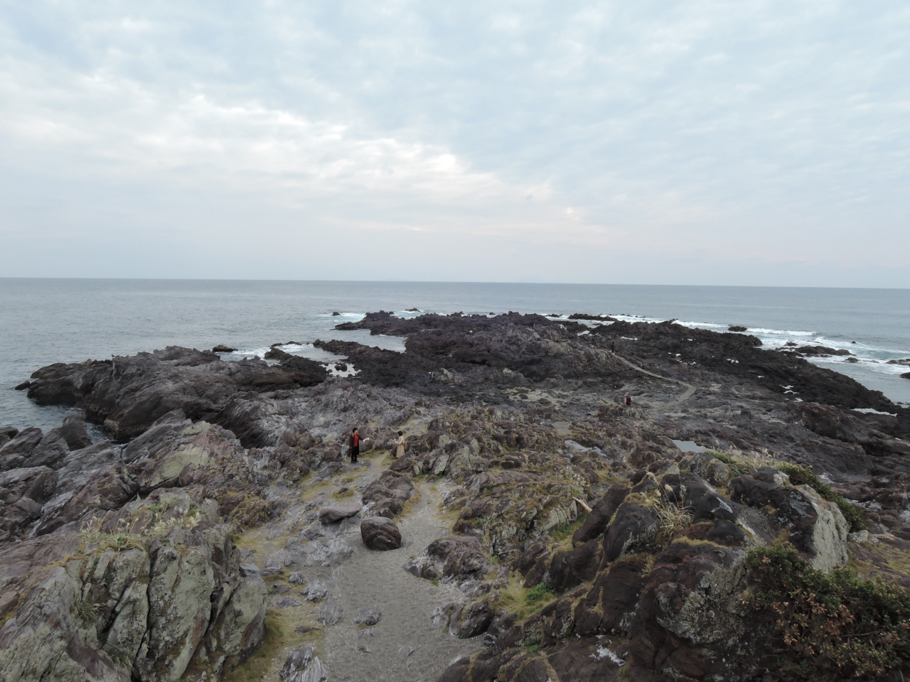 バスの駐車場から岬までの通路はお土産店がいくつも続いています。店の前には面白いキャッチコピーが掲示されていました。初めて通りかかる人は面白おかしくて、吹き出してしまうほど。よく考えてこういう言葉をつくったと感心するばかり。途中、竜宮神社で参拝してから、いよいよ散策路を歩いて長崎鼻へ。形が少し変わった灯台や散策路から見える開聞岳を見るのもいい。像の鼻のような岬の先端では大小の岩石が波間から見え隠れして、いい景色を作っている。海の絶景に時間も忘れて見とれてしまった。