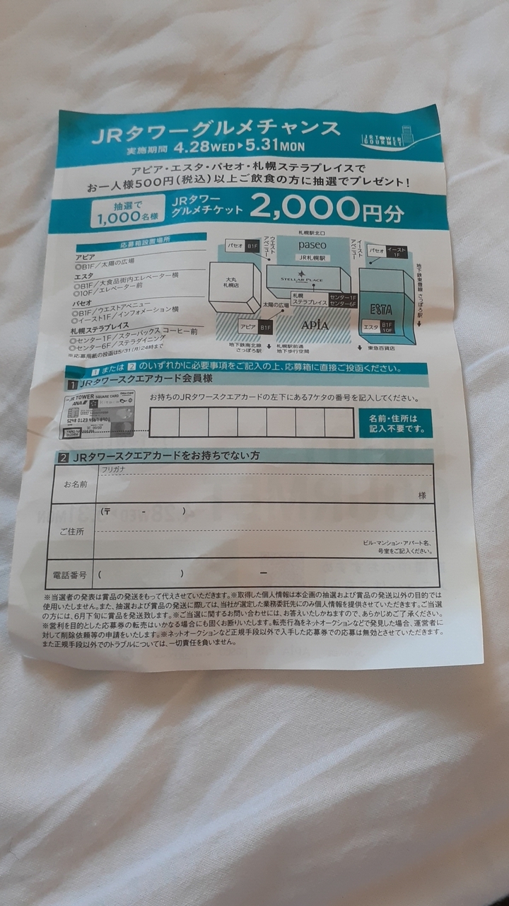 2021年5月のGW期間前後に2回程度飲食利用をしましたが、500円以上の飲食利用をしたところ、「JRタワーグルメチャンス」と記された応募用紙を頂きました。