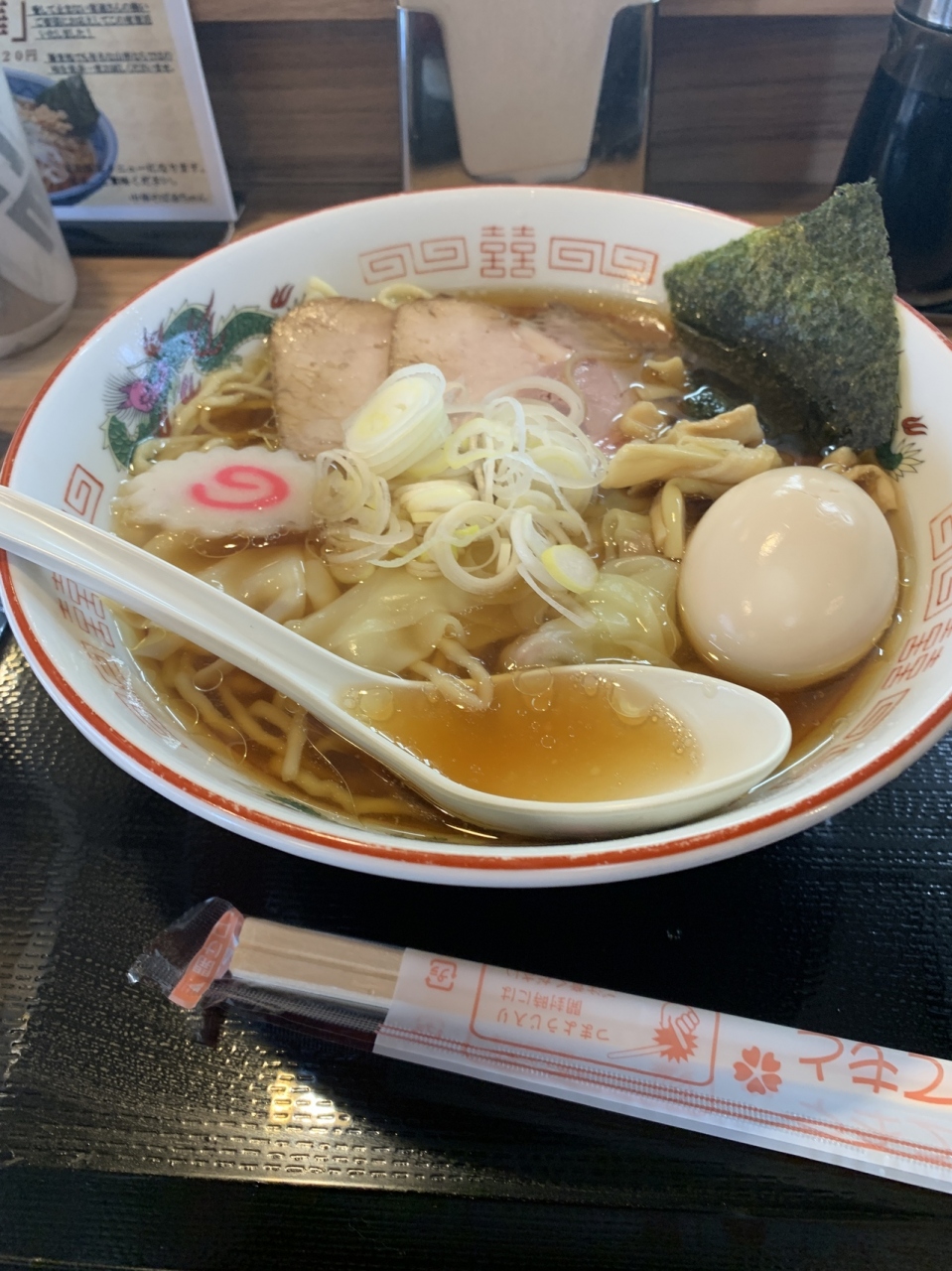 八千代市役所の前の立地する山形ラーメンの金ちゃんの暖簾分けのお店。麺は柔らかいがスープにマッチして美味しい。特製ラーメンがお得だが、やはりワンタンメンが食べたくなり、味玉をつける。