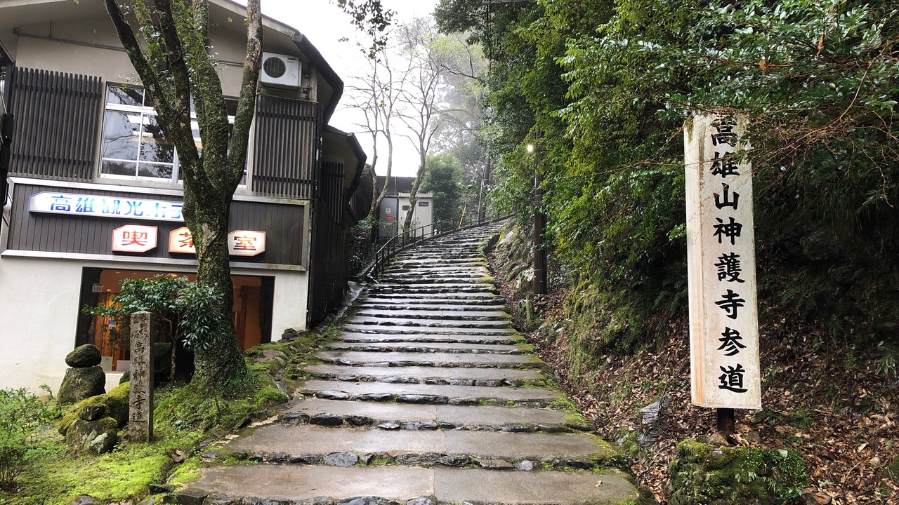 高山寺・西明寺と並ぶ、三尾のお寺の一つです。高雄バス停から、徒歩15分ぐらいです。バス停から清滝川まで坂道を降り、高雄橋を渡ると緩い石段を上がり、境内ではさらに急な石段を上がります。山の中のお寺なので、アップダウンが激しかったです。