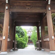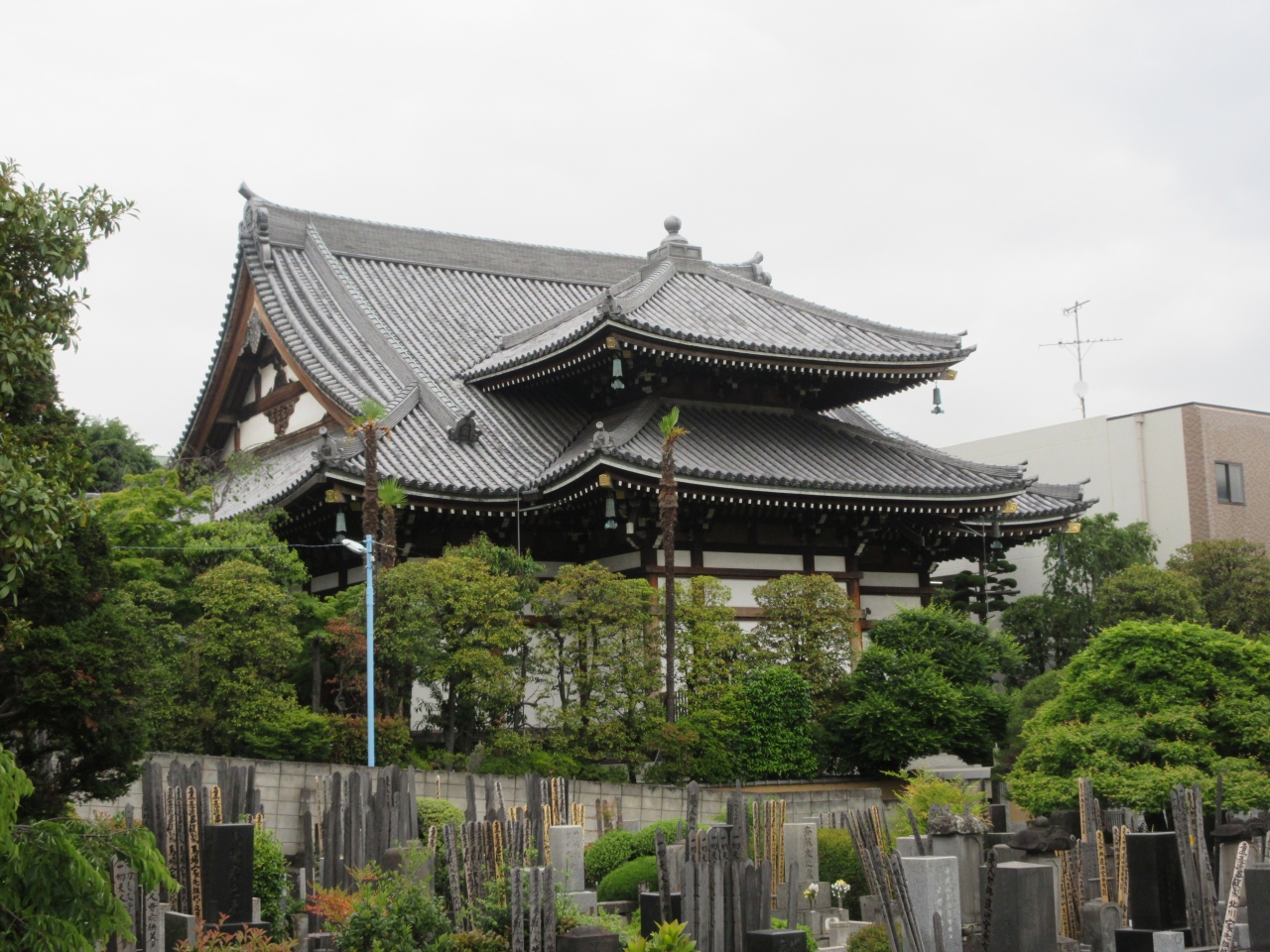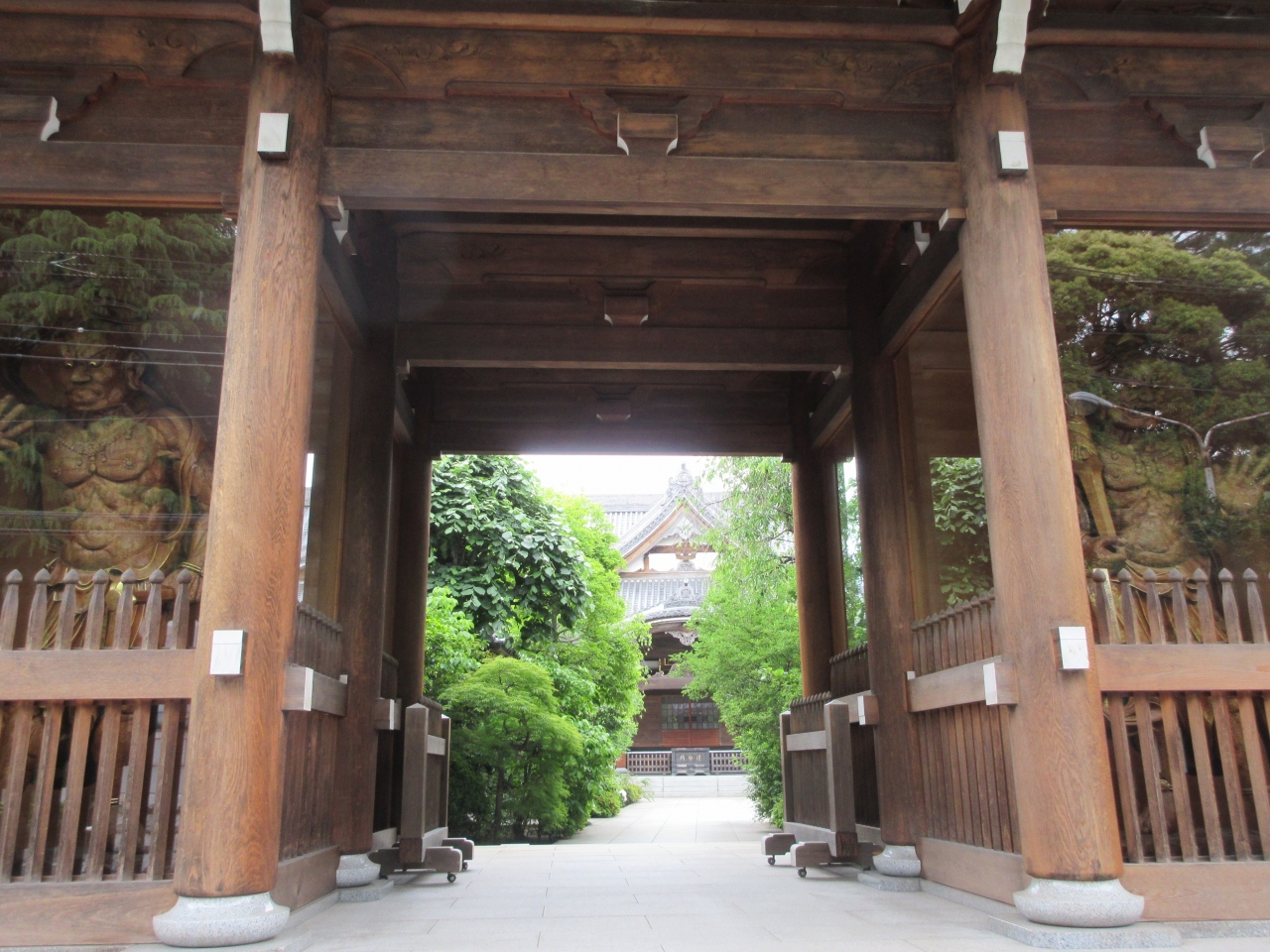 丸ノ内線・中野富士見町駅から10分ほど、救世軍ブース記念病院向かいに建つ日蓮宗の寺院です。移転を繰り返し、そのたびに土地を与えられてきたためか広い敷地を持つ寺で、墓地側から本堂を見ると、瓦屋根の上にもう一層の瓦屋根が乗っているような堂々とした姿をしています。木造の大きな山門には、ガラスで守られた仁王像が安置され、像の裏には毘沙門天王と持国天王が祀られています。境内と塀沿いには高く成長した木々が植えられ、緑に囲まれた寺という雰囲気も感じられました。見ごたえがある本堂と山門です。