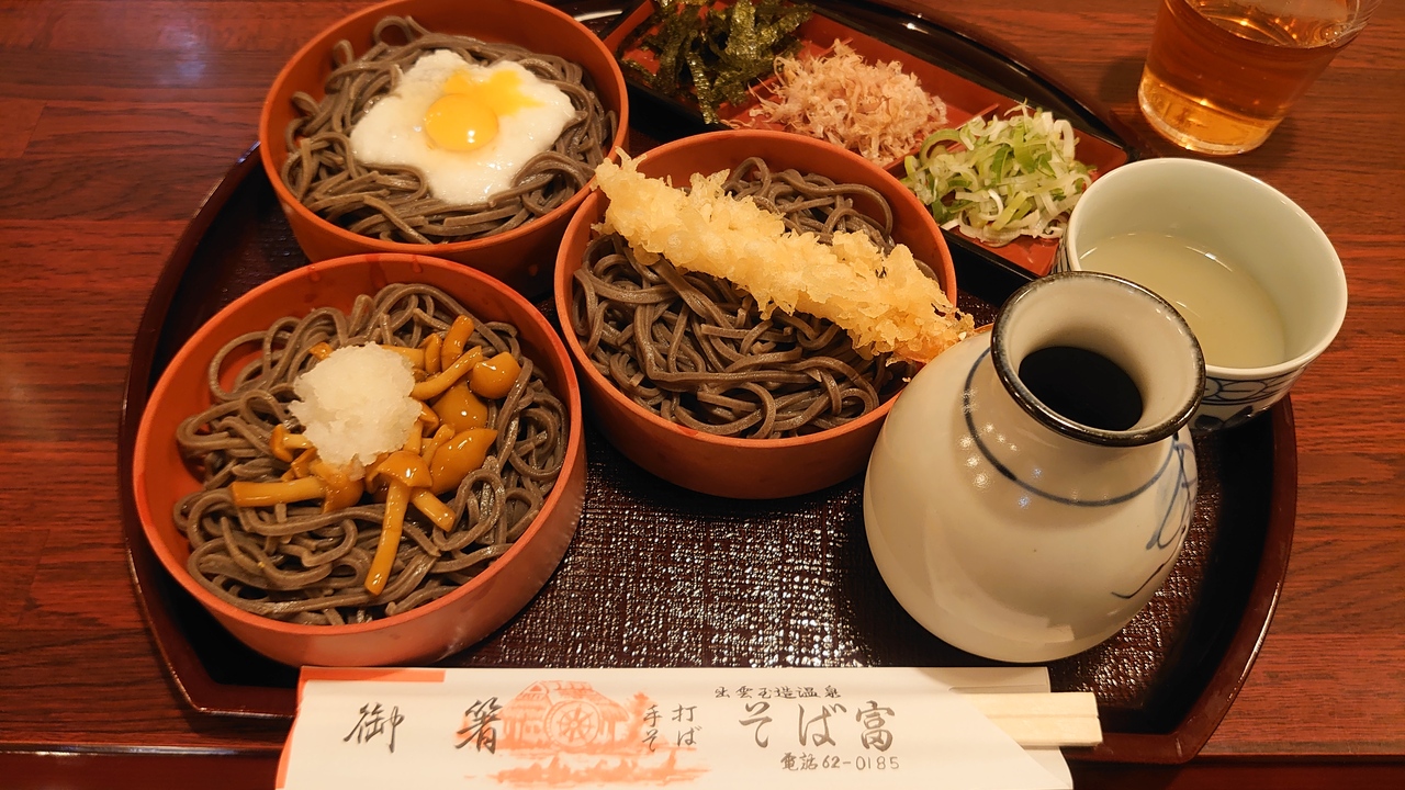 駐車場はあるけれど、車で行くと通りにくい狭い路地に面しています。看板や店構えから怪しい雰囲気を感じつつも飛び込みで入ってみたら、当たりでした。手打ちの割子そばは、海老天、なめこおろし、とろろたまごの三種で特にとろろたまごと合わせるのが絶品でした。