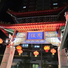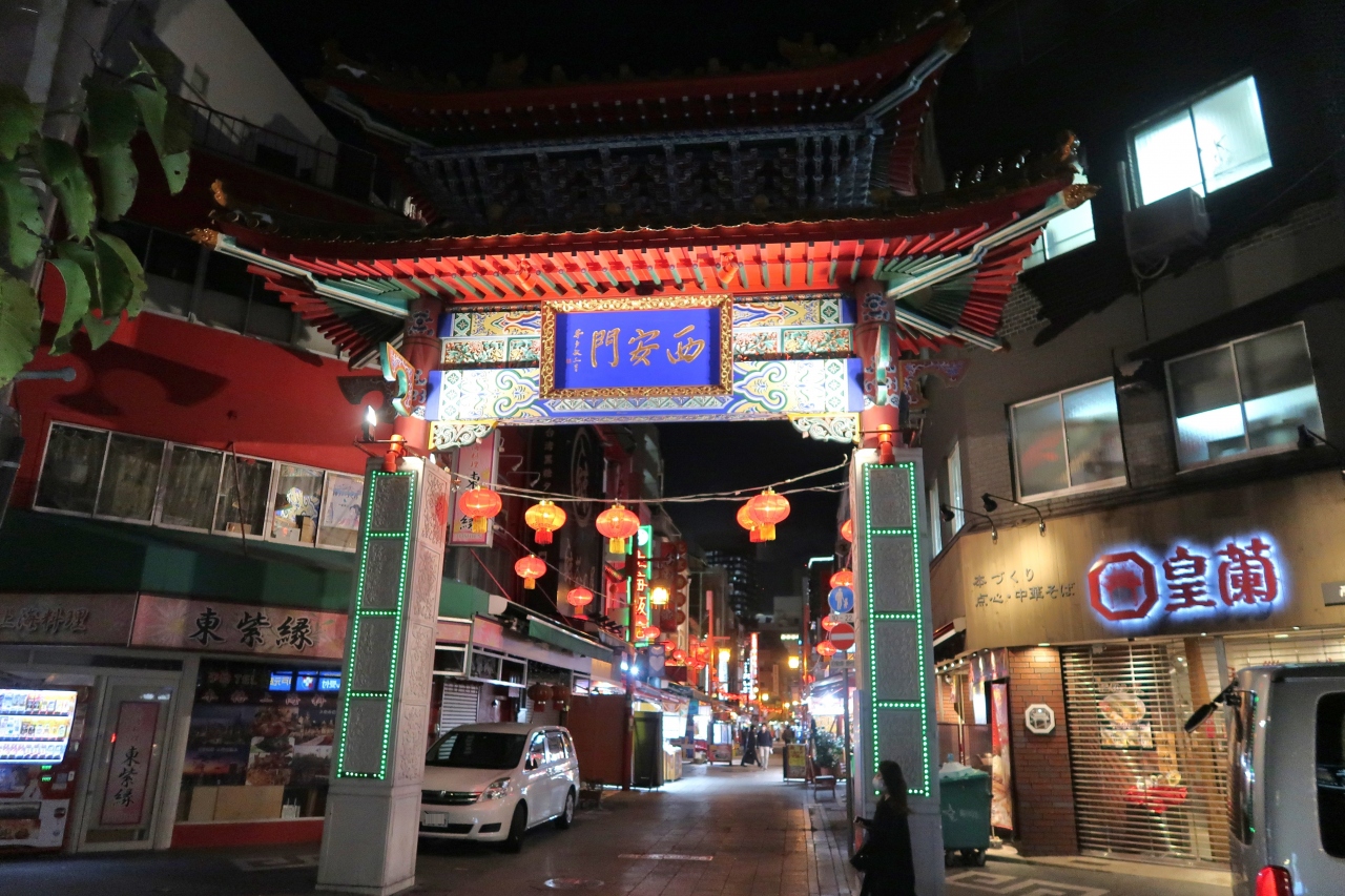 メリケンパークから歩きましたが、南京町西の入口の西安門に到着した頃には、日も落ちてしまいました。が、ライトアップで鮮やかな西安門を見ることができました。震災から10年を機に復興のシンボルとして建てられ、内側には光復の文字が掲げられています。