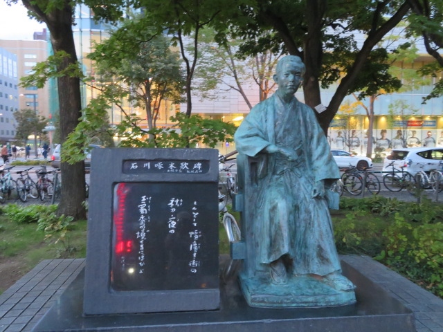 石川啄木の歌碑は小樽の駅前にありましたが、こちらのは歌碑のみでした。大通公園の啄木の歌碑は、少し茂みにあります。そして、啄木の銅像も横に立っています。和服姿で物静かな啄木らしい雰囲気がよく出ています。