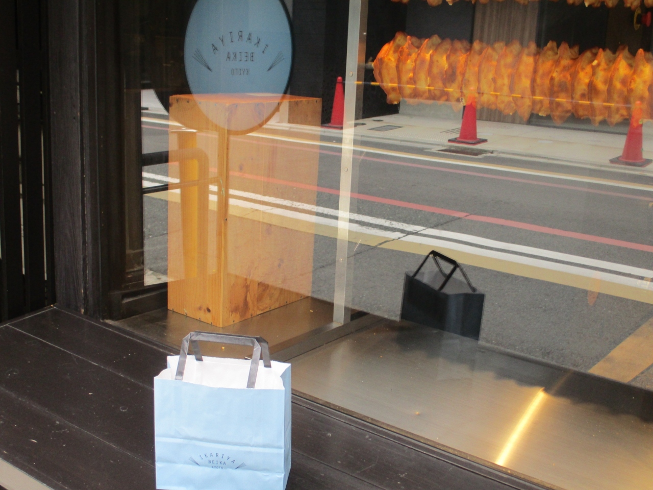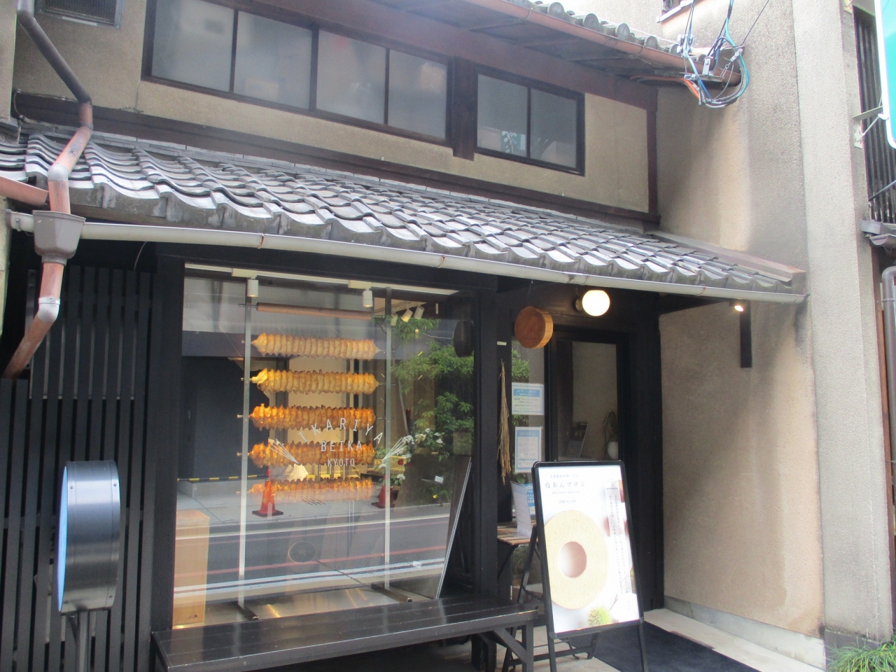 京都の高倉通にある、自家製粉した米粉で作られたバウムクーヘンのお店です。京町家のお店で、ショーウインドウ越しにバウムクーヘンオーブンが見えます。今回初めて訪れました。フワフワ、ザクザク、ショコラ、抹茶など種類があり、迷いました。