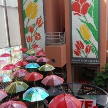 砺波チューリップ公園近くにある施設。館内のガーデンには数多くのチューリップが咲いており、一年を通じて楽しむことができるようだ。