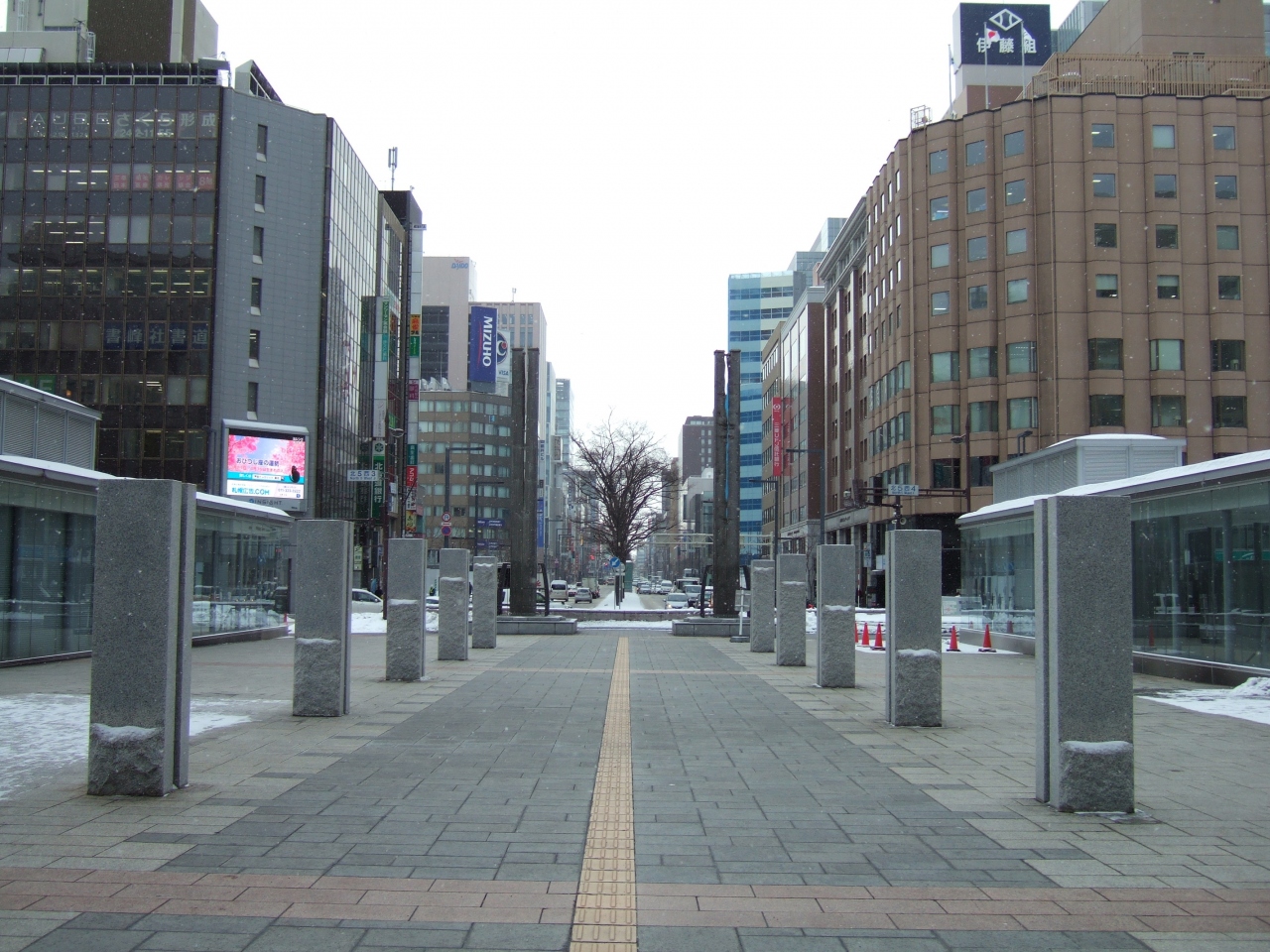 札幌駅の南口を出ると、南へ向かって真っすぐに伸びている駅前通り。駅前は丁字路になっています。冬でも歩道はかなりロードヒーティングが入ったり、路面店の方が一生懸命除雪をしてくれていますが、それでも段差があったりして冬は歩きづらいです。