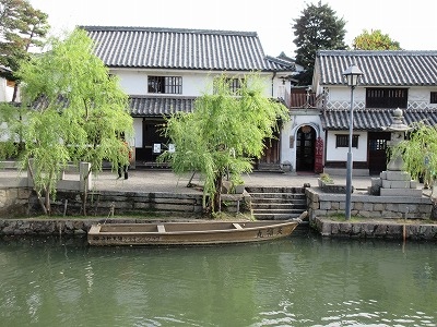 倉敷美観地区の中央にある石造の橋で、倉敷川はここで屈折します。どの角度から見ても、カメラスポットになるような素敵な光景です。