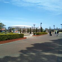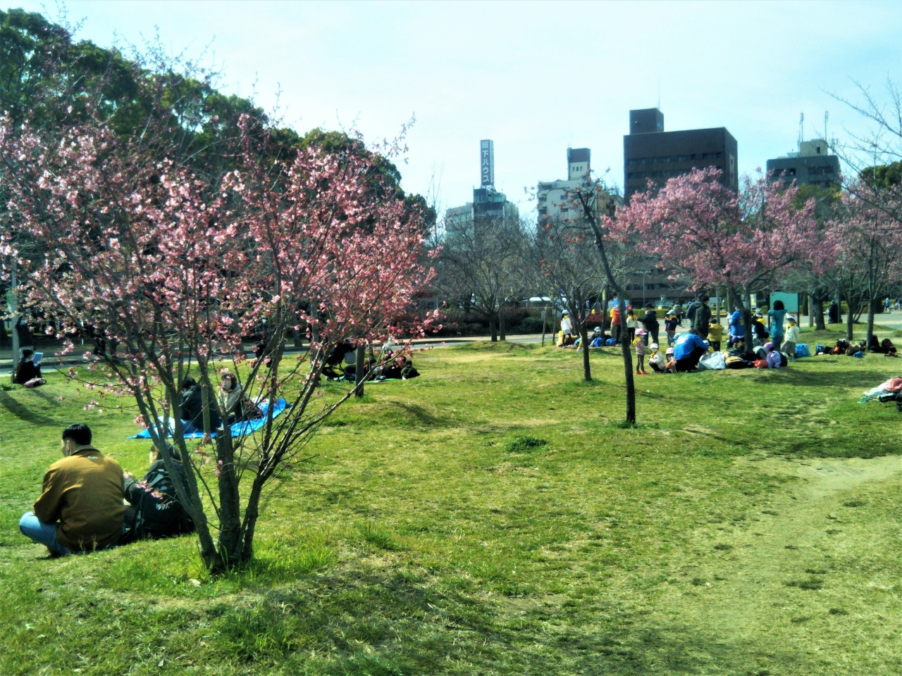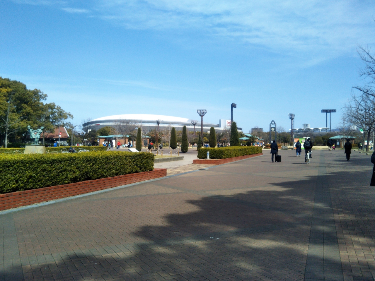 地下鉄御堂筋線の長居駅から上がると公園の南西角にでます。公園内は大きな広場の他、2つの競技場 (ヤンマースタジアム長居、ヤンマーフィールド長居)があります。また東側には植物園と博物館もあり、家族連れで一日楽しむのに最適。ラグビー観戦で訪れましたが、早咲きの(多分)桜が開花していて春近しを感じました。