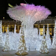 なんばパークスに11月に行った時、クリスマスのイルミネーションが飾られていて、とてもきれいでした。クリスマスツリーではなく、白いガラスのオブジェで、色が変わり目を引きました。夜しか見られませんが、何人か写真を撮っていました。