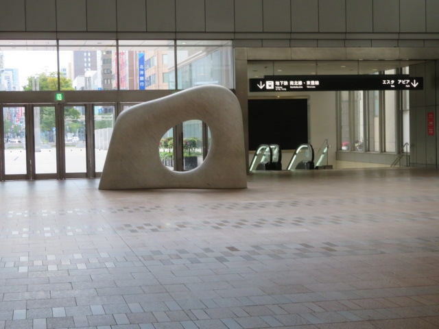 札幌駅にある謎のオブジェです。白の大理石からできている感じで、有名な方のアート作品だと思います。説明板は置いてほしいですね。くり抜かれた円の形は非常に綺麗です。役割といえば、どう見ても待ち合わせ場所ですね。