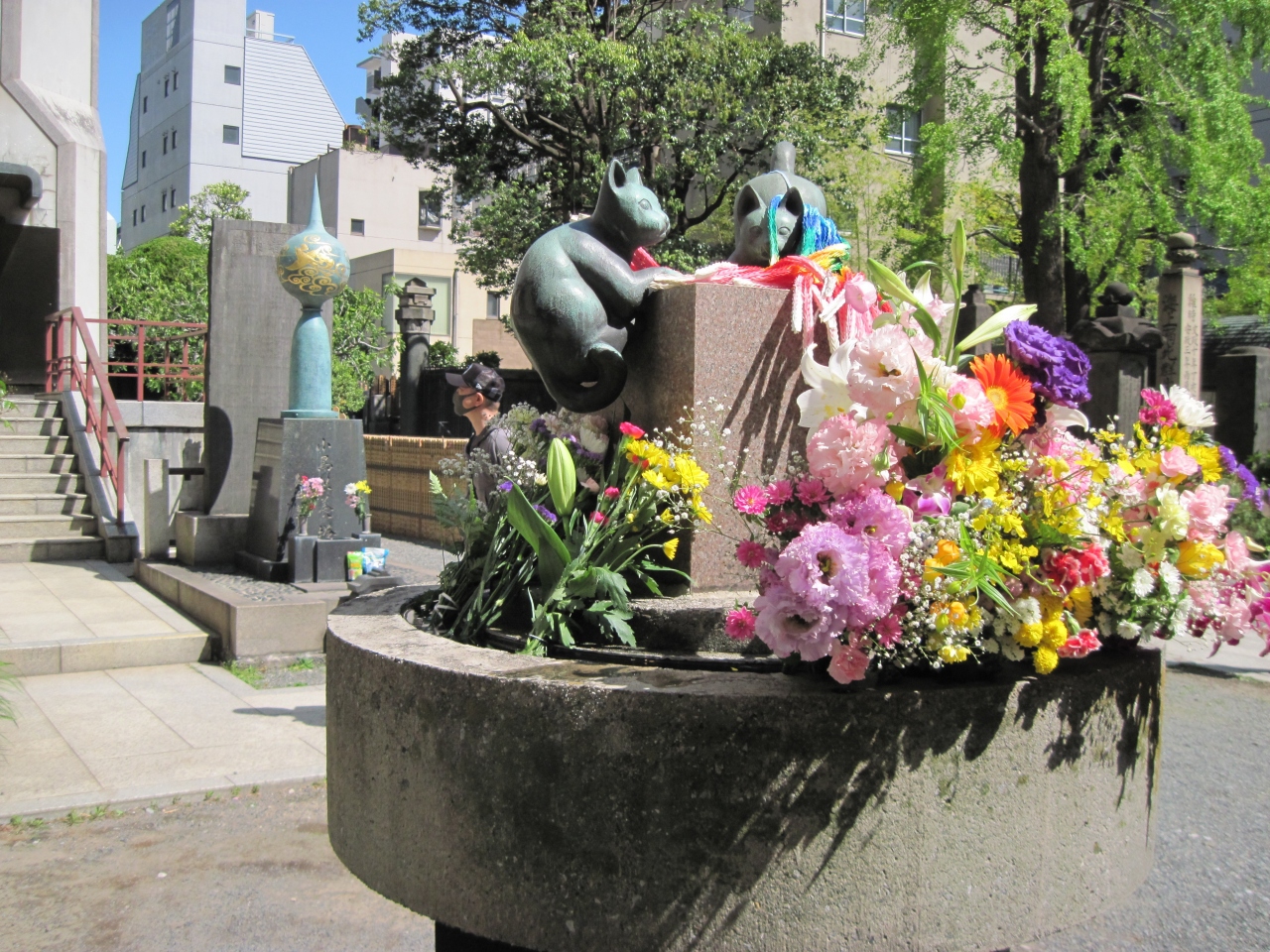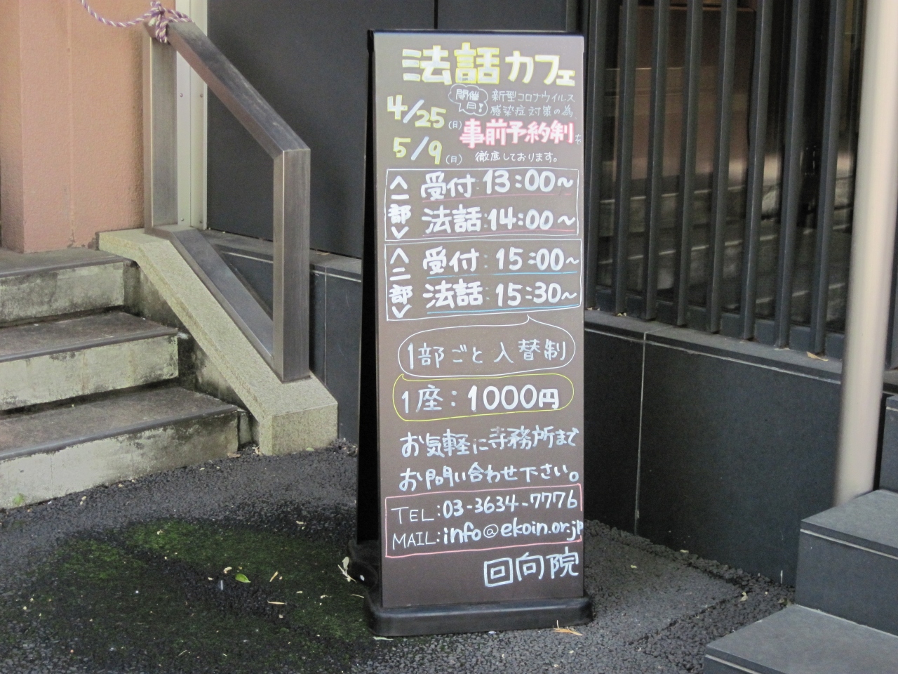 江戸時代、明暦の大火での死者を弔うため建立された寺院ですが、境内には犬や猫のようなペットも弔うことが出来るようで、お花に囲まれた犬と猫の像がありました。また、本堂の前には、黒板に法話カフェの案内が掲示されていて、お茶を飲みながら、気軽に仏教のお話をお聞きするといった、ちょっと新しい試みも行われているようでした。