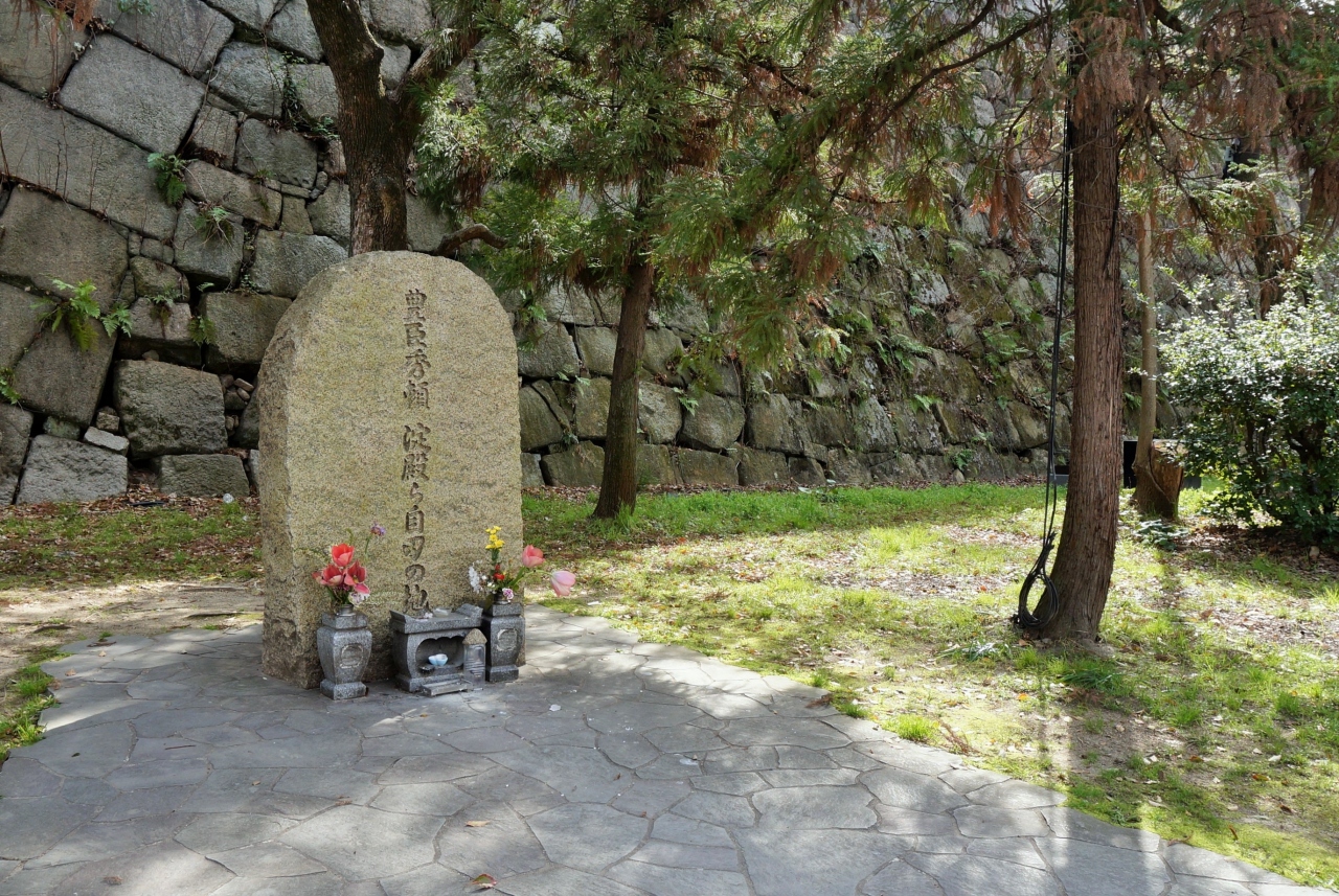 大坂城の山里丸の一角に「豊臣秀頼 淀殿ら自刃の地」碑が立っています。
