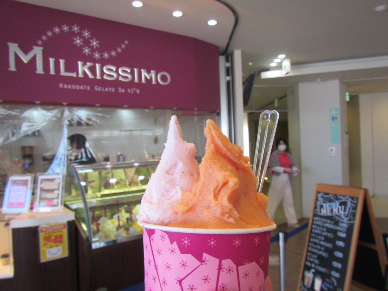 五稜郭タワーの展望階からの帰りのエレベーターを降りた2階にある函館地盤のアイスクリーム(ジェラート)屋さんの支店です。五稜郭の展望を楽しんだ帰りの経路で必ず通るので、ついでに楽しんでいくことができます。レアチーズ、ヨーグルトなど十数種類のアイスをシングル(\410円)、ダブル(\500円)、トリプル(\580円)で種類を選んで食べることができます。