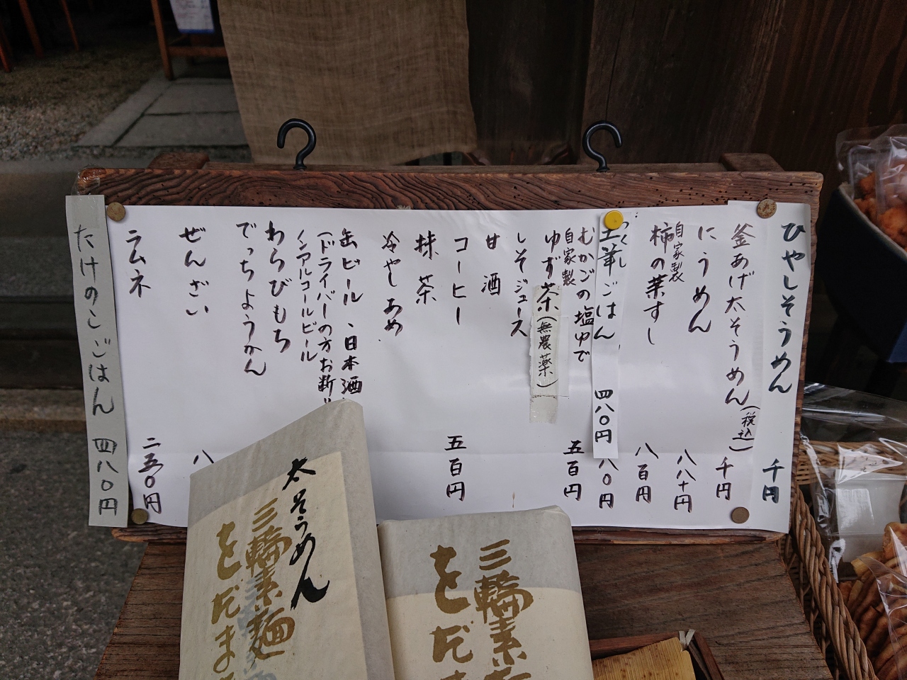 大神神社の長い参道を出てすぐ右側にある古い佇まい。三輪そうめんの老舗でそこそこ有名店です。にゅうめんと柿の葉寿司のセットを頂きましたが、にゅうめんは出汁がしっかり効いて美味しい&柿の葉寿司との相性もバッチリでした。中の方は分かりませんが、入口入った辺りのテラス席がメインなのかな?天気のいい日は気持ちよく頂けます。
