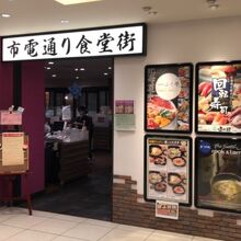 新千歳空港のレストランフロアの一部が、石畳のレトロな雰囲気になっています。市電も置かれており、ここが市電通り食堂街です。スープカレーの「lavi」、函館朝市の「きくよ食堂」、寿司の「函太郎」など、北海道を代表する店が6店集まっています。