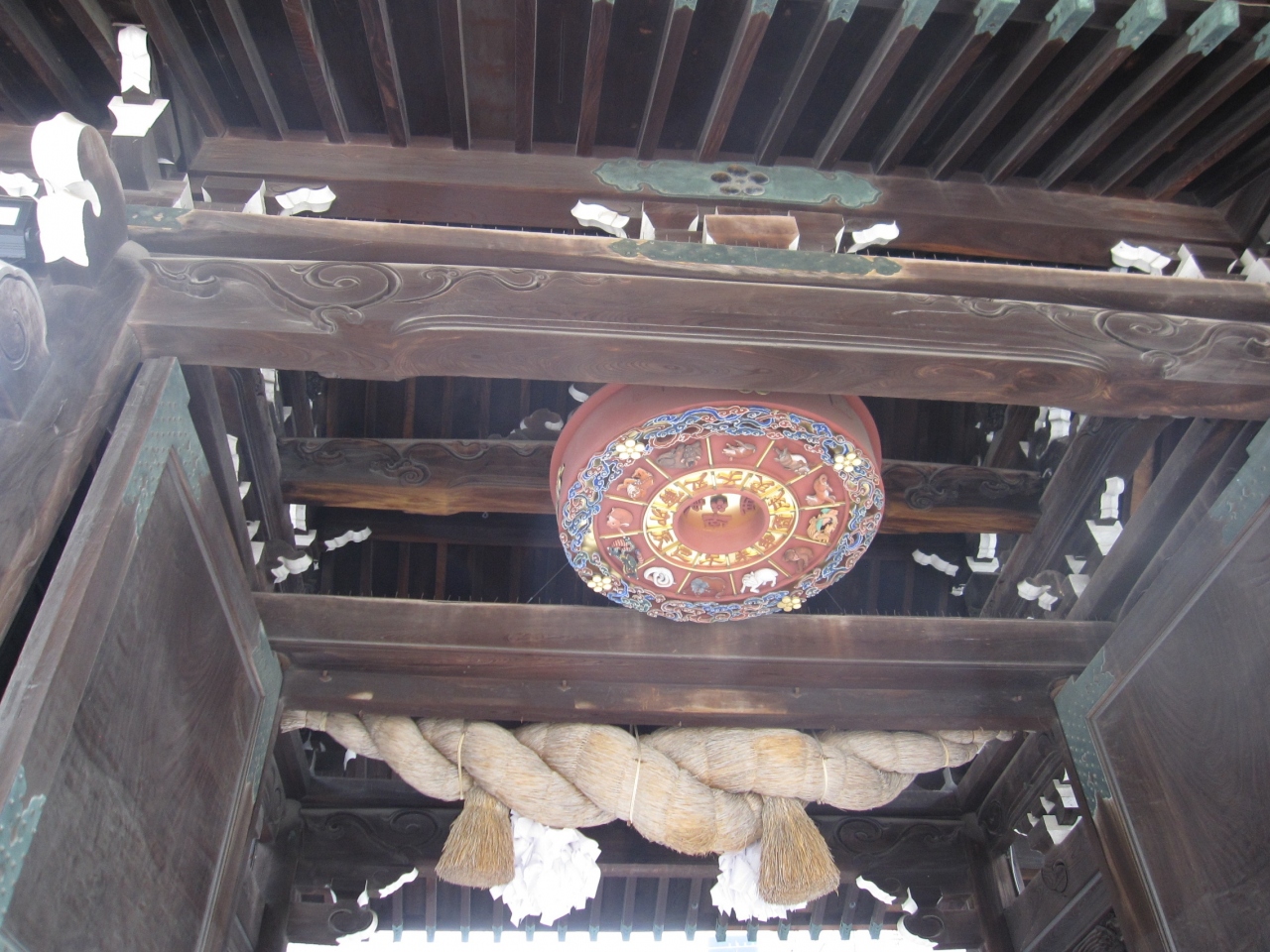 表大門には大きな注連縄が張られ、その天井には「十二支方位盤」が掛けられています。