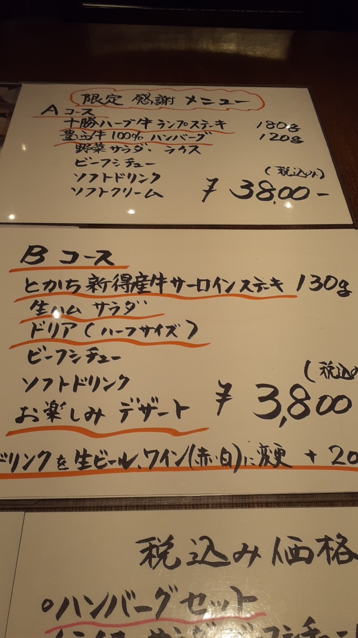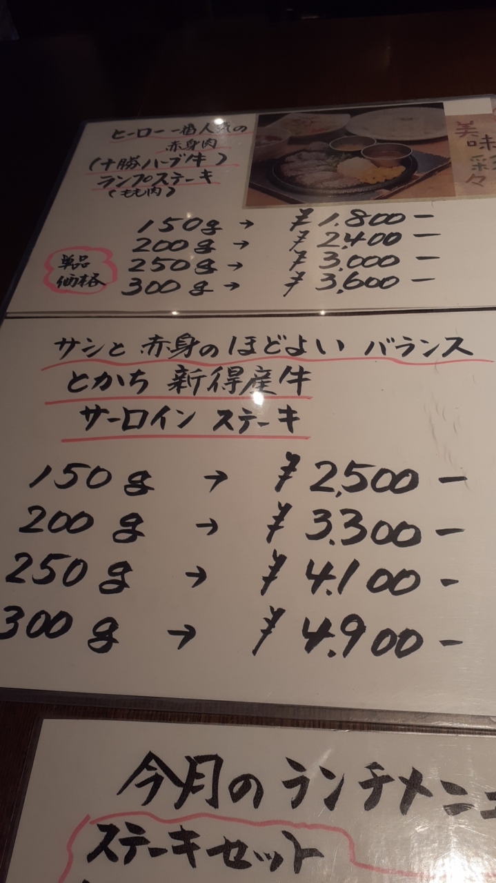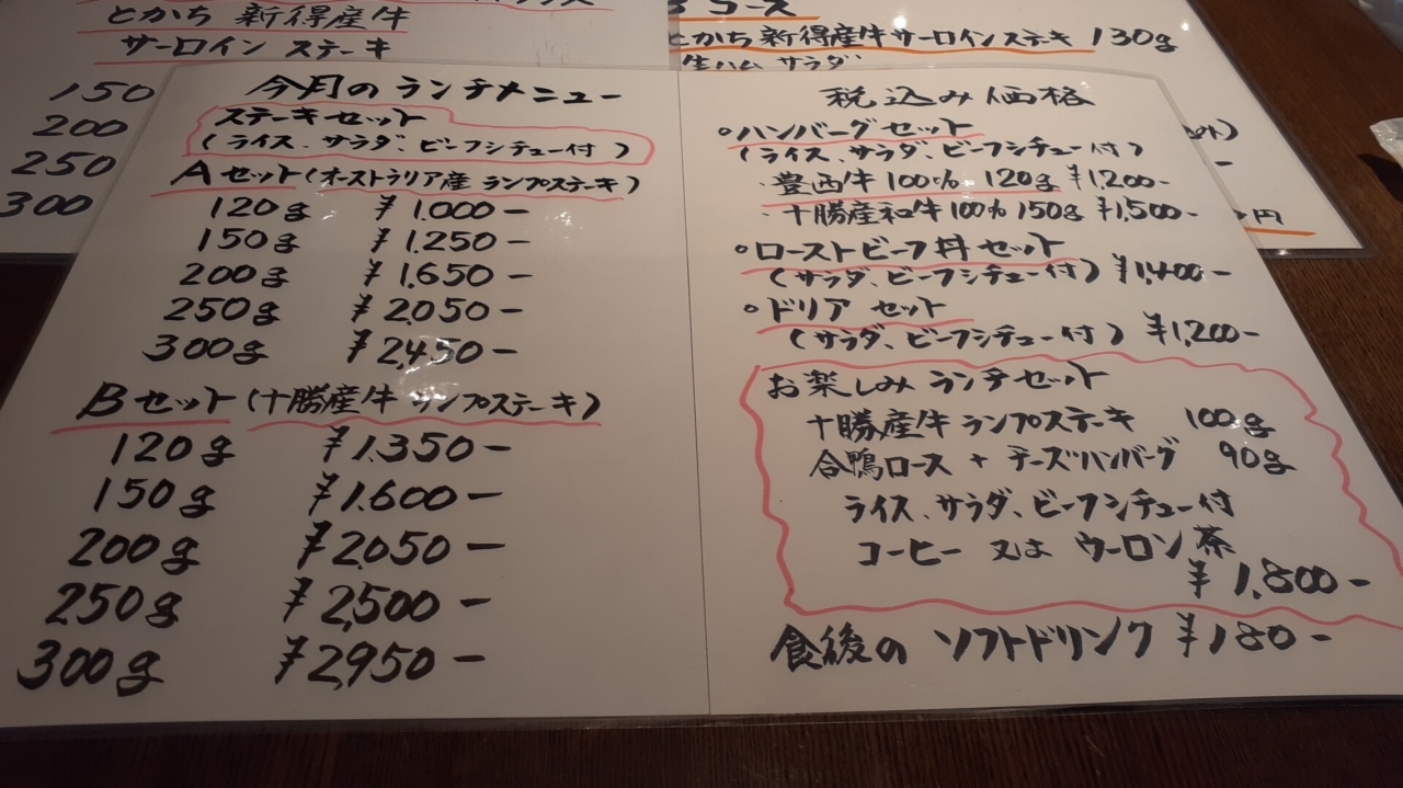他のお店で十勝牛のステーキの値段を調べたところ、5,000円前後するらしく、ランプステーキにはなりますが、十勝牛を僅か2,000円程度で頂けるのはスゴいと思いました。