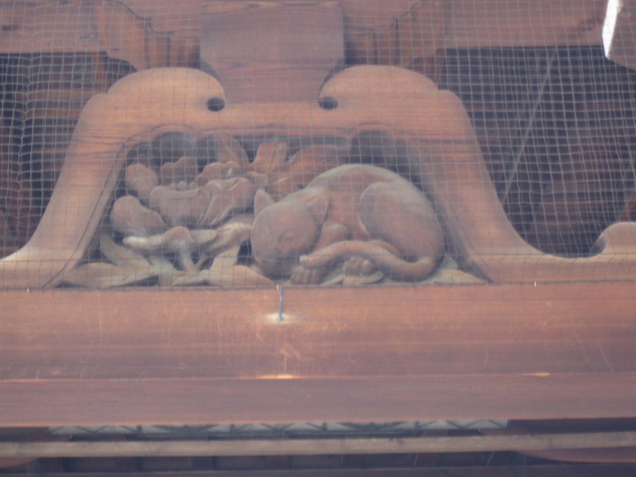 前殿には、上欄に虎の彫り物がある「寅の門」と、猫の彫り物がある「猫の門」の2つの門があり、「寅の門」の虎は悪いものが入ってこないように番をし、「猫の門」の猫は聖霊院にある経堂のお経がネズミにかじられないように見張り番をしているそうですが、眠る猫の彫刻か飾られた「猫の門」しか確認できませんでした。
