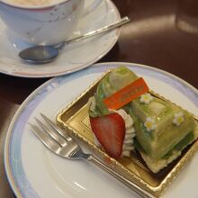 ココアスポンジに、ムースを盛って前方後円墳の形に仕上げている。ぷるぷるのムースをよくここまで精巧な古墳に仕上げられたな、と感心。