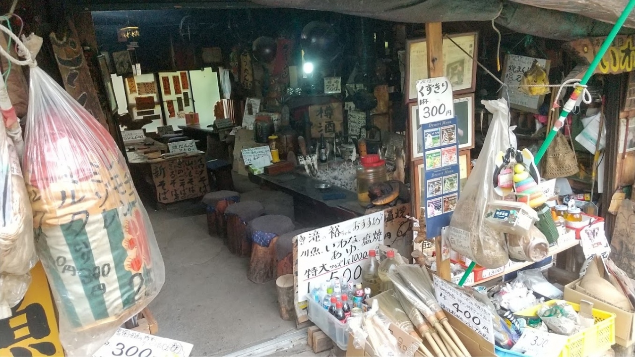 吹割渓谷遊歩道に下りていく途中にある昔ながらの土産物と食事処です。土産物、農産物など無造作に並んでいます。店内に囲炉裏があり、岩魚などを焼いていました。
