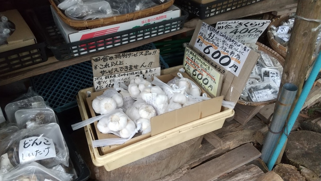 他の店がコロナかで閉店しているのに、この店は営業して魚を焼いているのを見て、立派に思えました。地元産の「雪化粧にんにく」を中国産以下の破格の値段で売っていて、本当かと疑ってしまいましたが、買っていけばよかったかなと思いました。