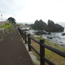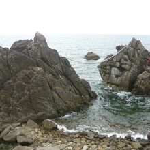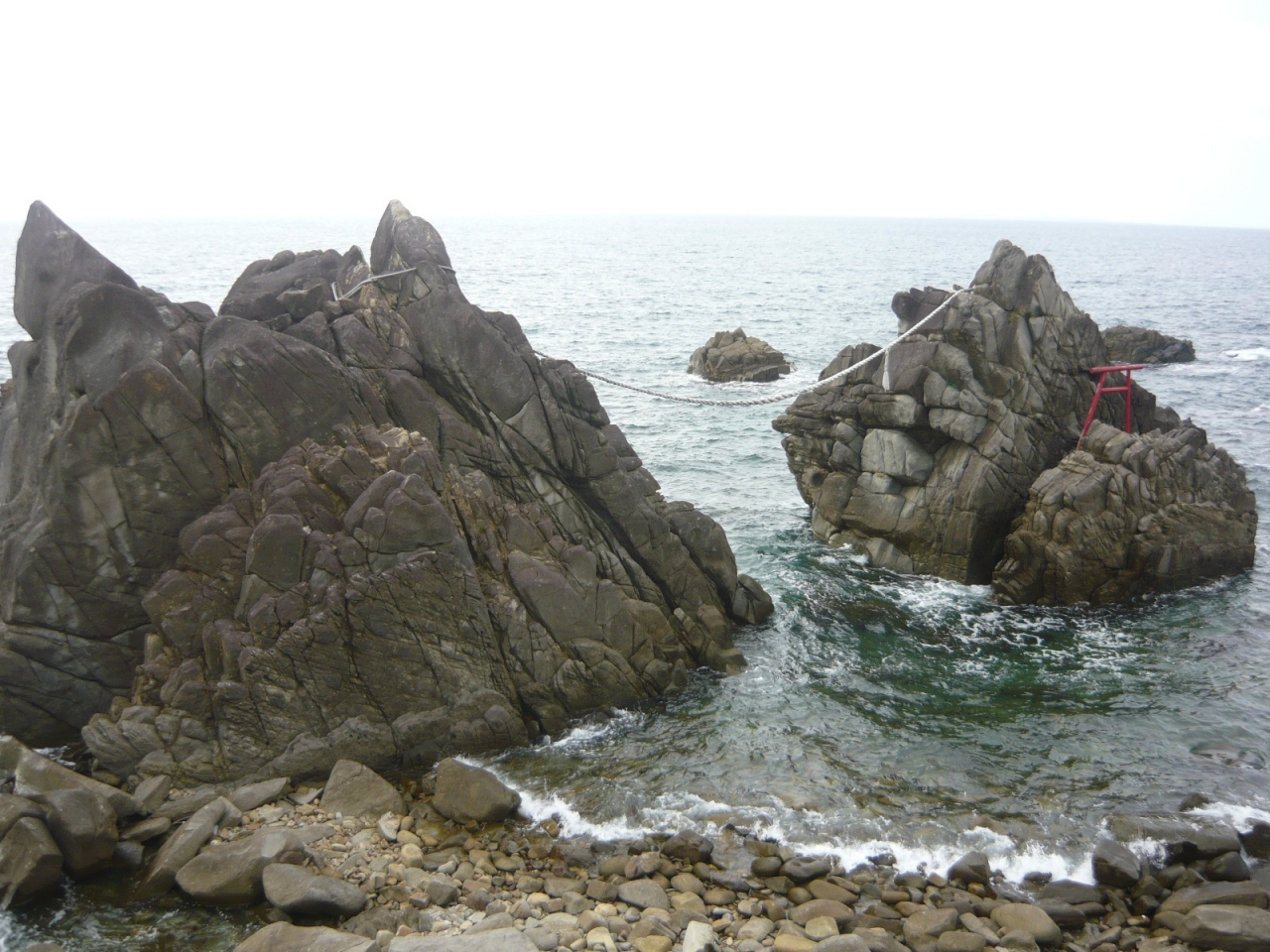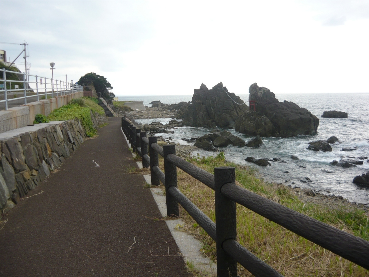 日本全国によくある夫婦岩の一つで、昔、嵐の夜に崖崩れによって海に投げ出された夫婦の生まれ変わりという伝説の岩です。わざわざ観に行くようなものではありませんが、国道58号線沿いにあり、すぐ近くにベンチもあるので休憩のついでにでも。