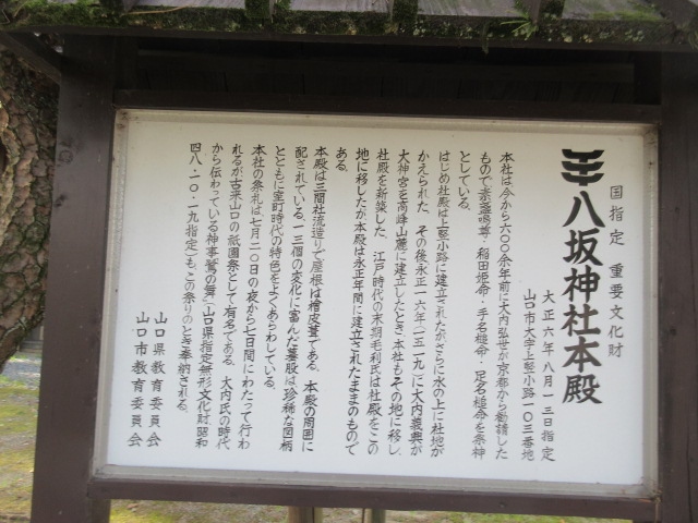 山口市にある神社です。車で行きましたが駐車場もありました。赤い大きな鳥居が目地る石でした。本殿は重要文化財に指定されているもので、屋根はヒノキの皮で葺いてあって重厚な感じでした。大内氏が京都から勧請したものでした。