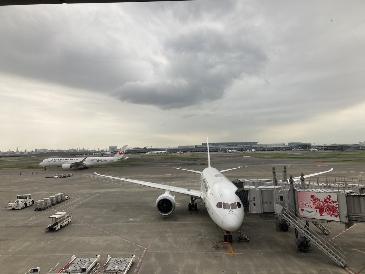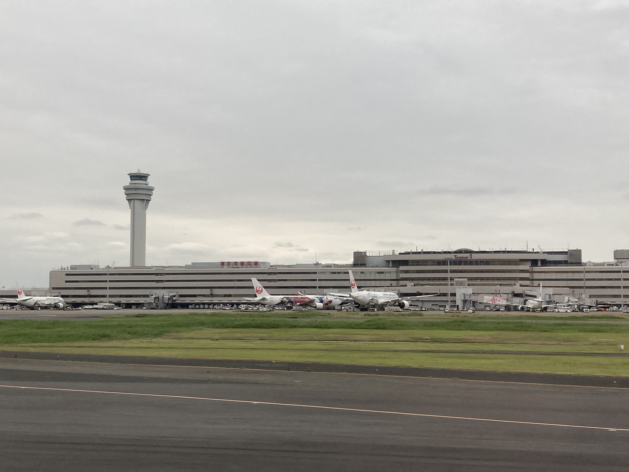国際線の運休が続いているようで、外国の航空会社の飛行機が見当たらず、日本航空と全日空が飛び交っていました。