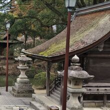 太宰府天満宮の広い境内には末社も多くあり、その一つが今王社です。参道を進むと心字池があり、その心字池架かる太鼓橋を渡ると右手に見えます。重要文化財に指定されている志賀社の手前にあり、こじんまりとしていますが、茅葺き屋根が特徴的な社です。なんらかの支障で本殿での参拝ができない時に、代わりに参拝するための末社とのことです。