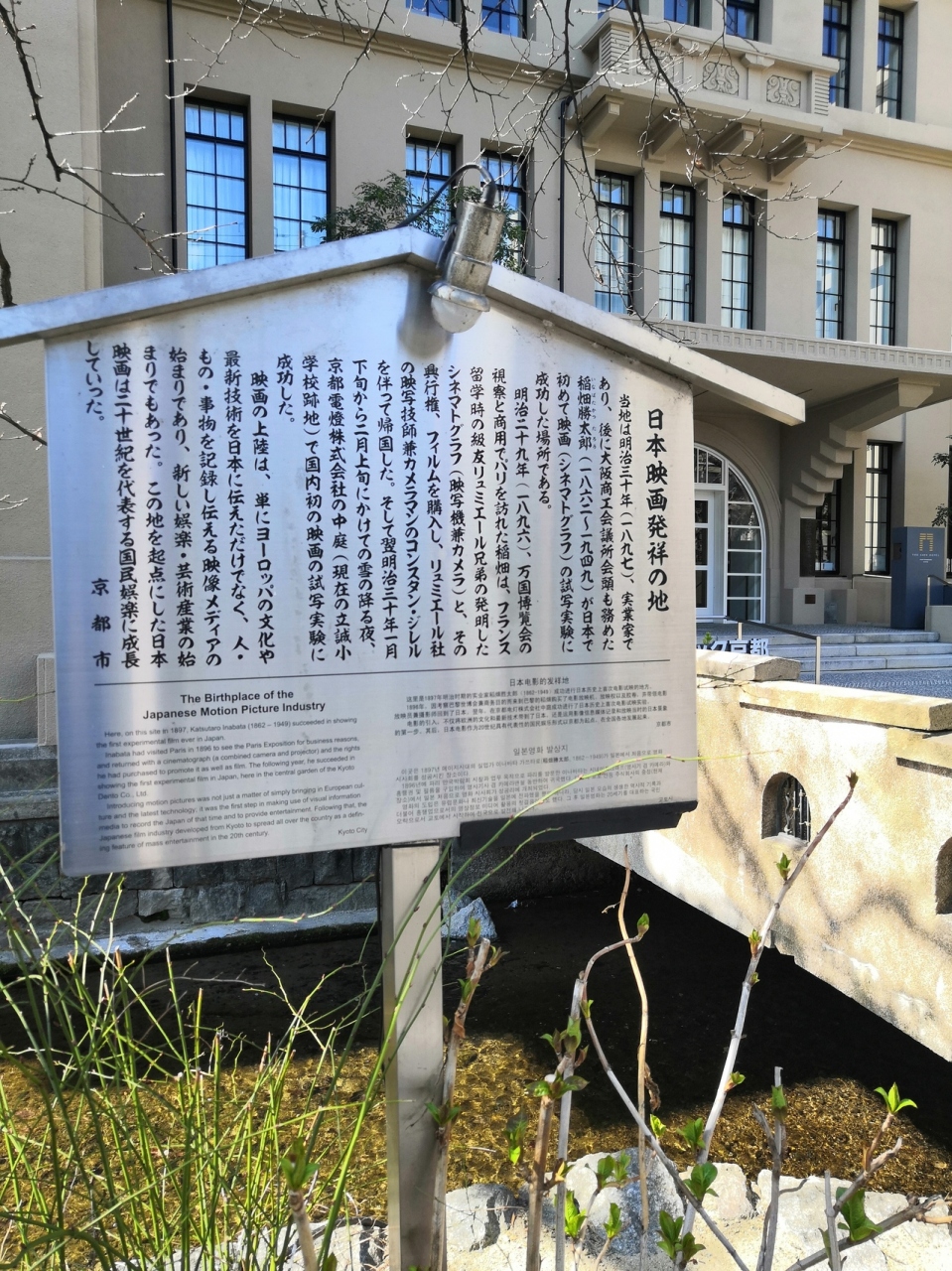 高瀬川沿いにあります。日本映画発祥の地というのは国内にいくつかあるそうですが、ここは映写機兼カメラであるシネマトグラフの試写実験に成功した場所だそうです。正直映画は詳しくないのであまりピンとこなかったです。
