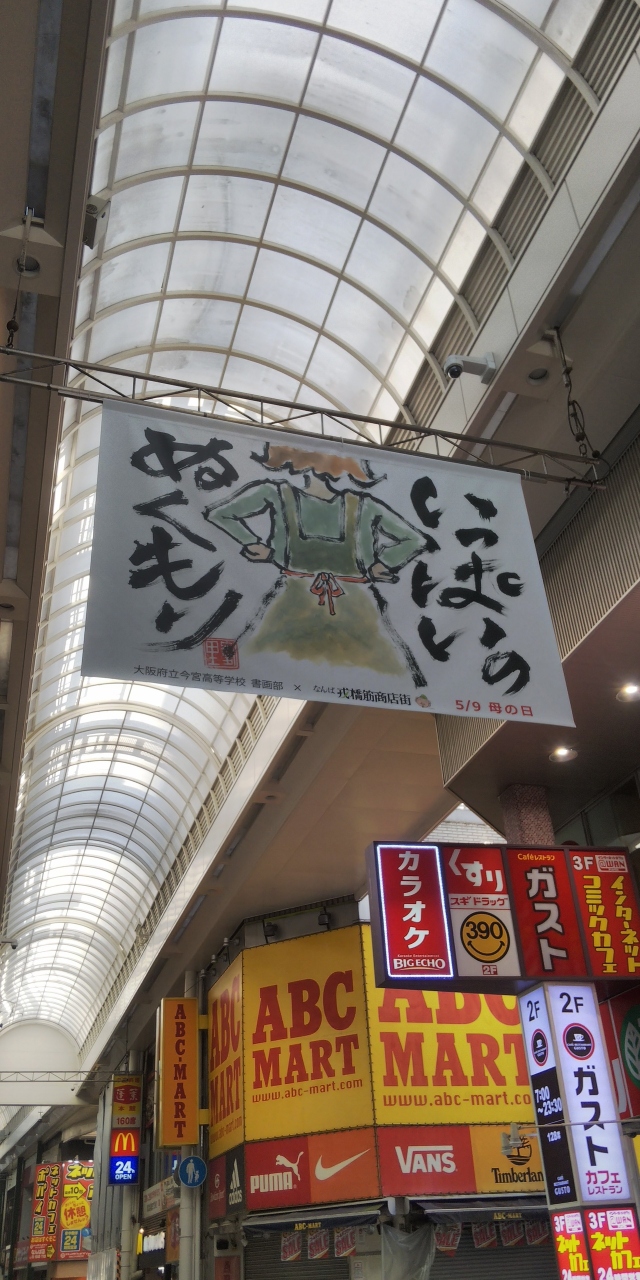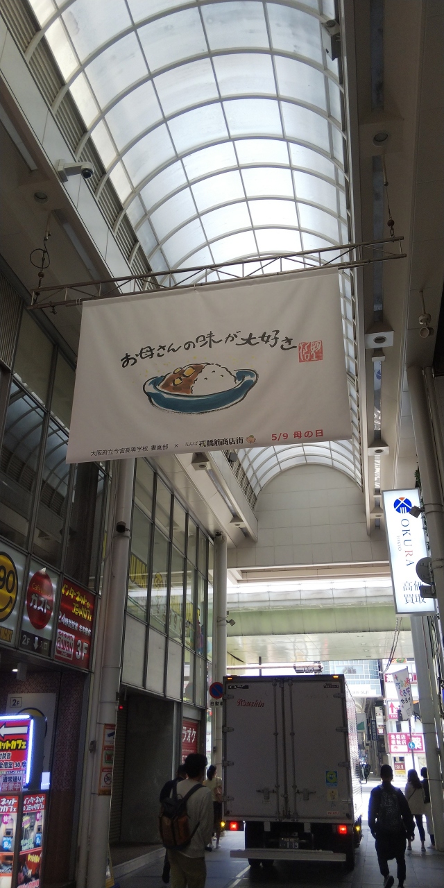 大阪・ミナミのど真ん中に位置する商店街です。アーケードがあり、上から垂らしてある旗が季節毎に変えられています。5月に行きましたので、「母の日」バージョンになっていました。名物老舗店から最先端のファッションをリードするショップまでが揃っています。