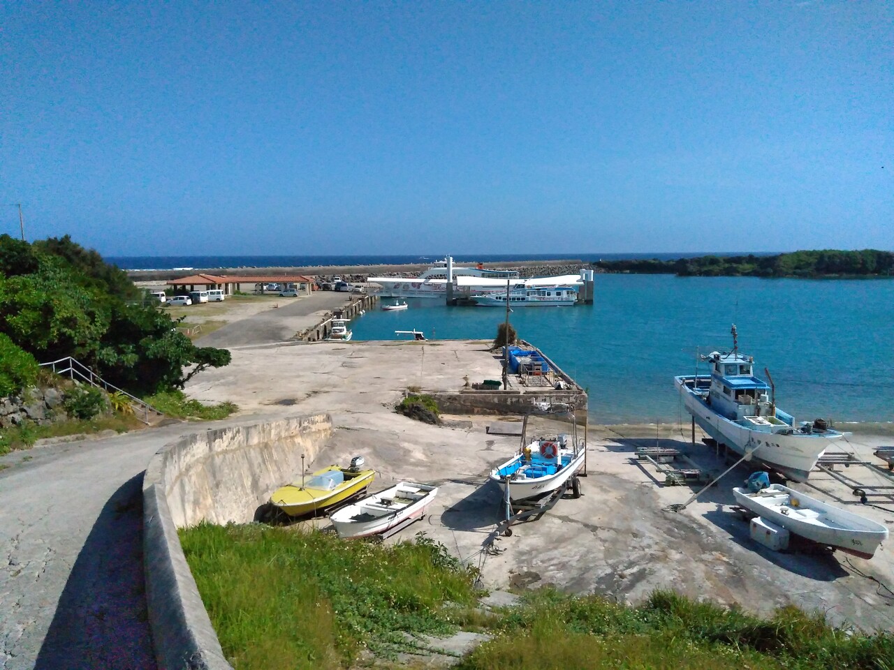 沖縄本島の安座真港からの船が着く久高島の港です。乗船券売り場は船の発着場所ではなく、道路を登った所にあります。レンタサイクルが並んでいるので、すぐに分かると思います。