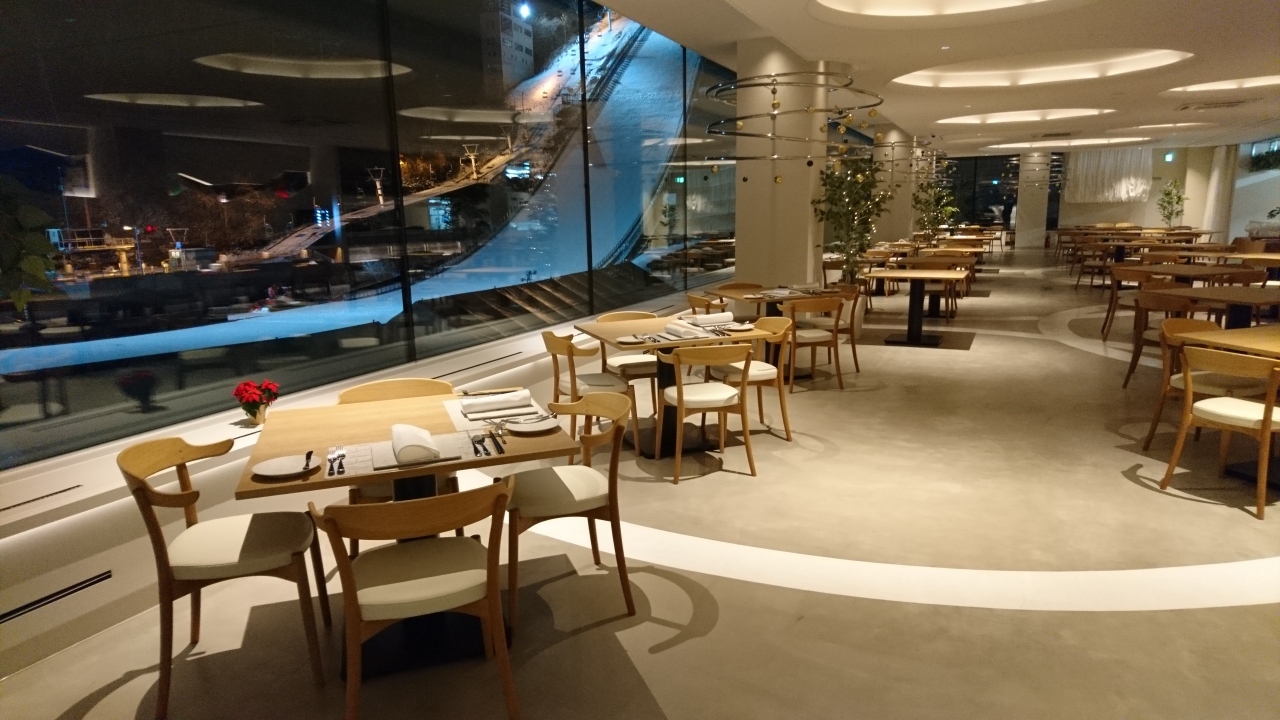 札幌の大倉山ジャンプ競技場にあるレストランです。ディナーをいただきに訪れたのでジャンプ台がライトアップされていました。大きな窓から、ジャンプ台を見ながら食事ができるなんて、日本ではたぶんここだけですよね。料理は、地元の素材を使った創作フレンチで、見た目にも美しいものばかりで感動しました。とてもおいしく、目の前に広がるジャンプ台にも感動しながらいただきました。