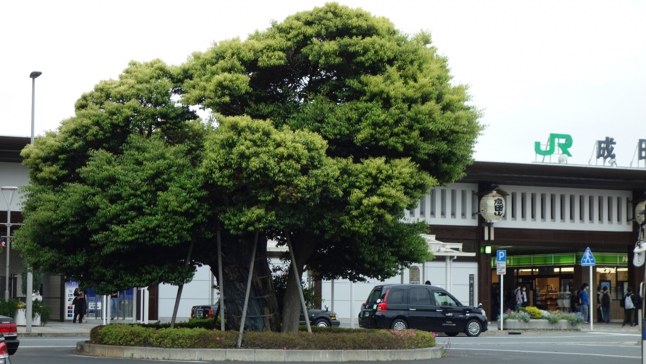成田あたりのエリアを散策中こちらの場所を訪れました。JR成田駅の東口側ロータリーに有る大きな椎の木で太い幹に多くの葉をつけ存在感を放っていました。まわりは建物でこの緑がひときわ目立っており生命感がありました。