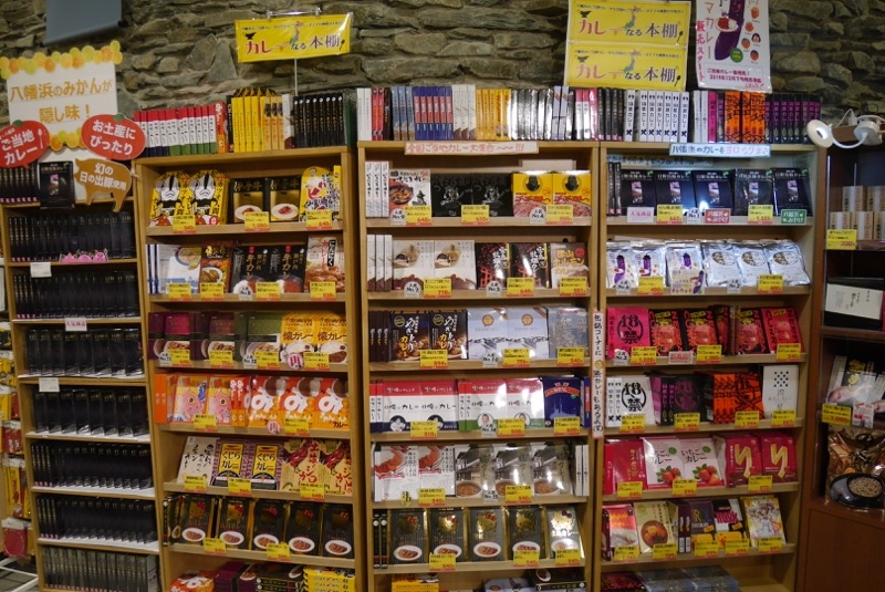 道の駅八幡浜みなっとの、おみやげ・産直・フードコートエリアを指します。道の駅のお店らしく地物中心のラインナップです。それ以外でちょっと珍しいな、というか目を引くな、と思ったのがカレーへの力の入れようです。本棚にカレーの箱を陳列した、カレーの本棚があり、なぜここでカレー!?と思いました。選びごたえあります。