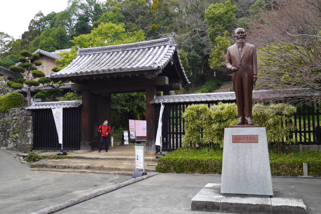 宇和島藩士の息子で、のちに政治家になった人…だそうです。宇和島城の上り立ち門の外側すぐに銅像がありました。「珍しいな」と思うのは、ふつう、お城のすぐにある銅像って、だいたい騎馬像、馬に乗っていなくても武将や、その妻の像だったりするじゃないですか。洋服を着た銅像がお城スグにあるってなかなかレアだと思います。門すぐなのでお城観光の際ふつうに見つけることができると思います。