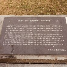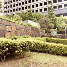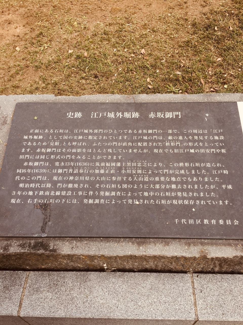 国の史跡でもある大きな石垣で、明治時代、門が撤廃され石垣も大部分が撤去されましたが地下鉄工事時に地下から発見された石垣を現状保存してあります。石垣島の上には草が生えていて、周りも整備された草が生え、首都高速道路の上に外堀跡があります。