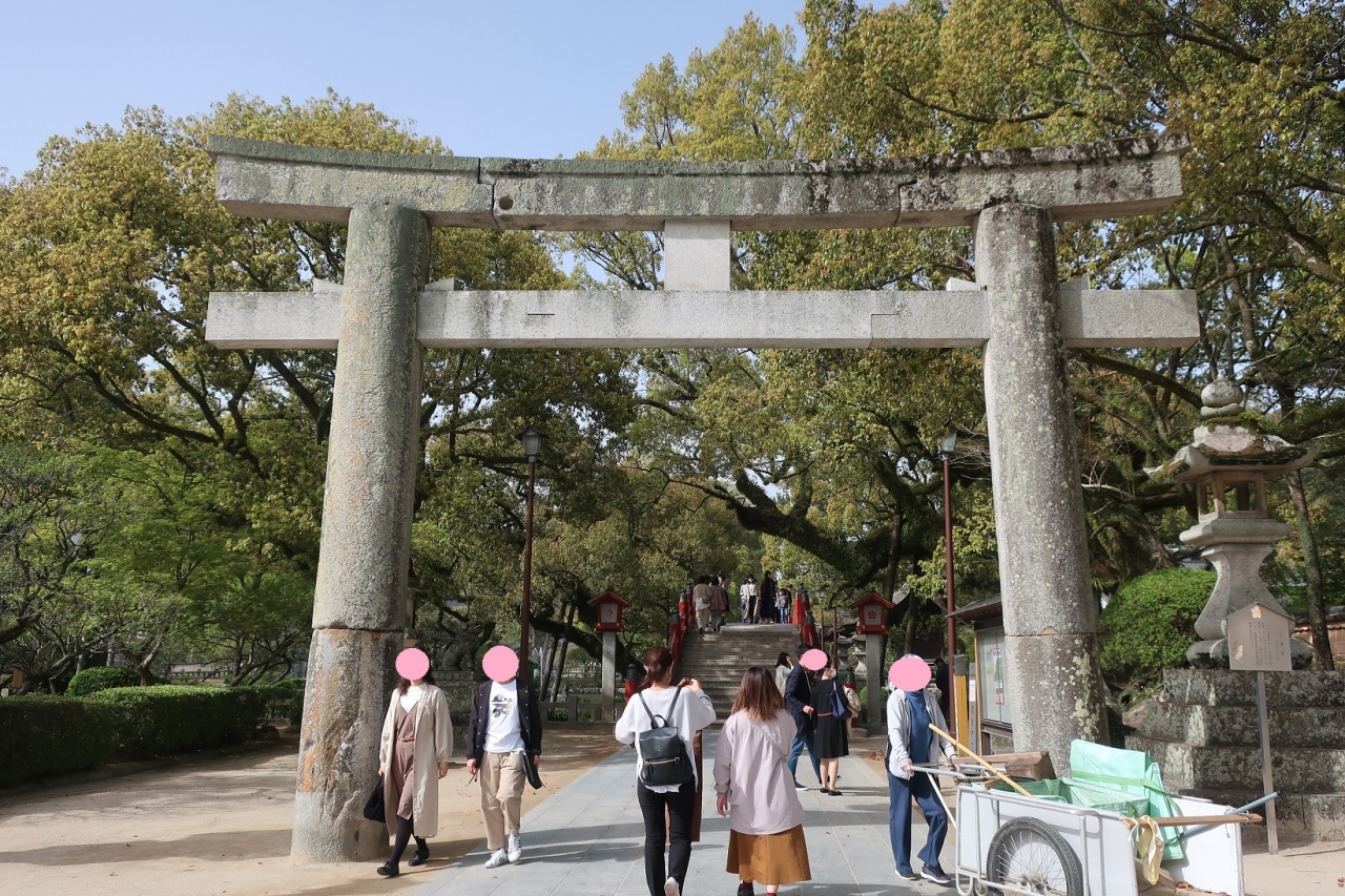 大宰府天満宮の案内所を過ぎ、御神牛の左手にあるのが石造りの鳥居で、「中世の大鳥居」と言われているものです。花崗岩でできた明神型の鳥居です。笠木はゆるやかに反っています。鎌倉末期に造られたもので、福岡県内では最古のものだそうです。大鳥居から見える太鼓橋、眺めが良いです!。