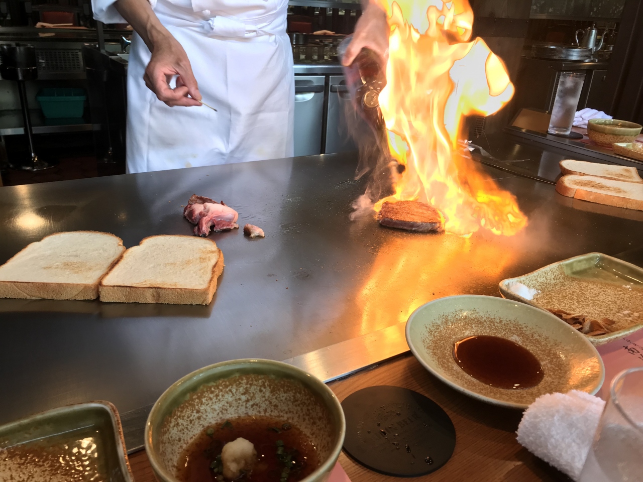 両親の敬老の日にランチを食べに来ました。前菜、ポタージュ、ステーキは、目の前の鉄板で、シェフが焼いてくれます。ステーキはパンの上にのせてくれて、最後にパンをたっぷりのバターで焼いてくれるのがとてもおいしいです。ゆっくりと食事ができ、とても満足しました。