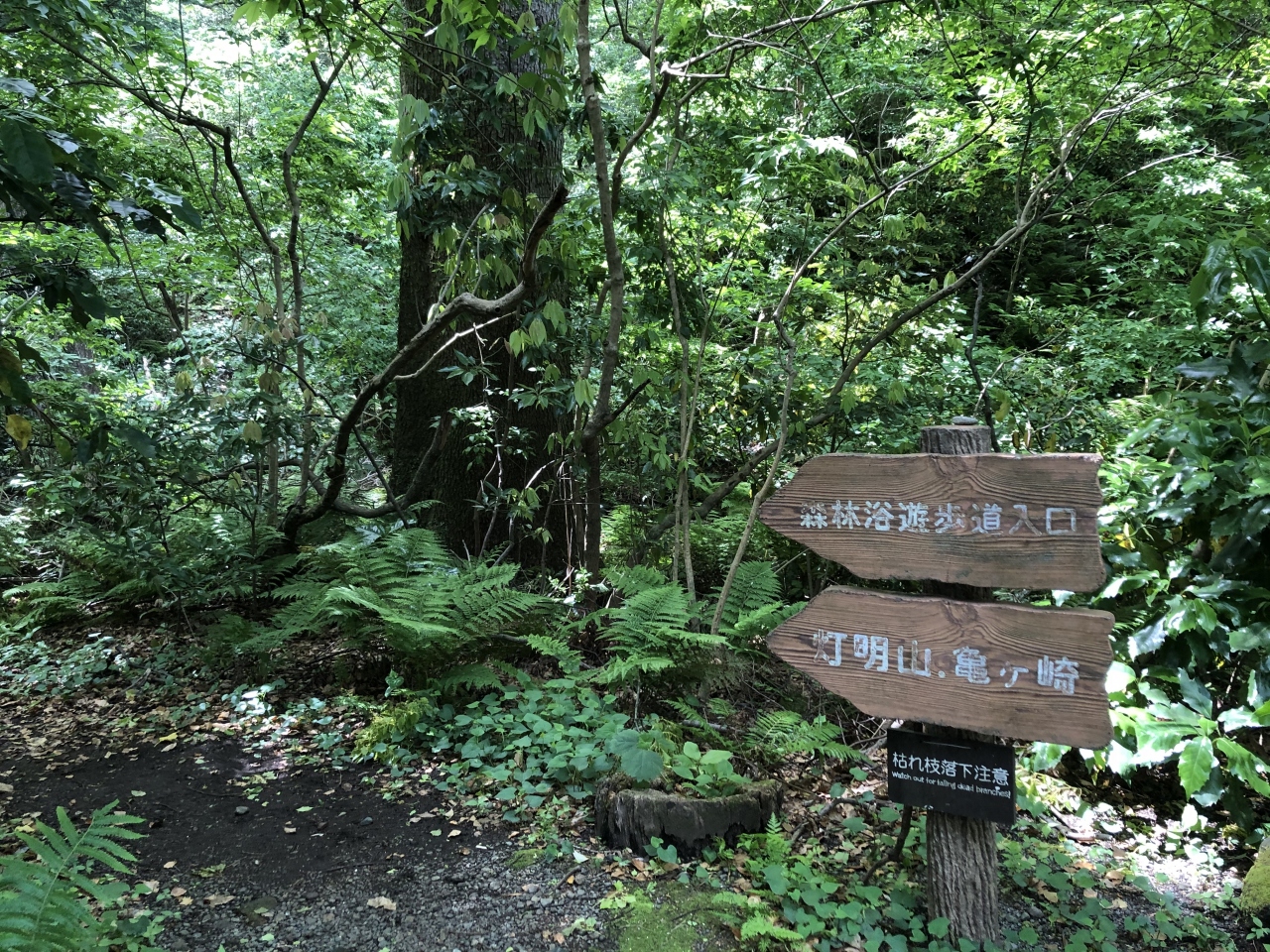 真鶴半島の海周りコースを歩いて、真鶴駅からケープ真鶴まで歩いたときに、この森林浴遊歩道を歩きました。県道739号線に沿って歩くと、琴ケ浜海岸を過ぎたところから真鶴半島の山の中に入っていきます。しばらくすると「森林浴遊歩道」の道標が現れたので、県道(バス通り)からそれて遊歩道の中に入りました。どこに抜けるのかよくわからないままに遊歩道に入りましたが、結果、県道を大きくショートカットして、お林駐車場近く(カープ真鶴の少し手前)で、県道に出ることができました。