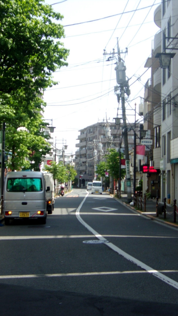 片側1車線の区道で、歩道は狭いが、街路樹も植えられ、人も車も通行量が多いと感じる。