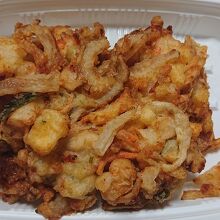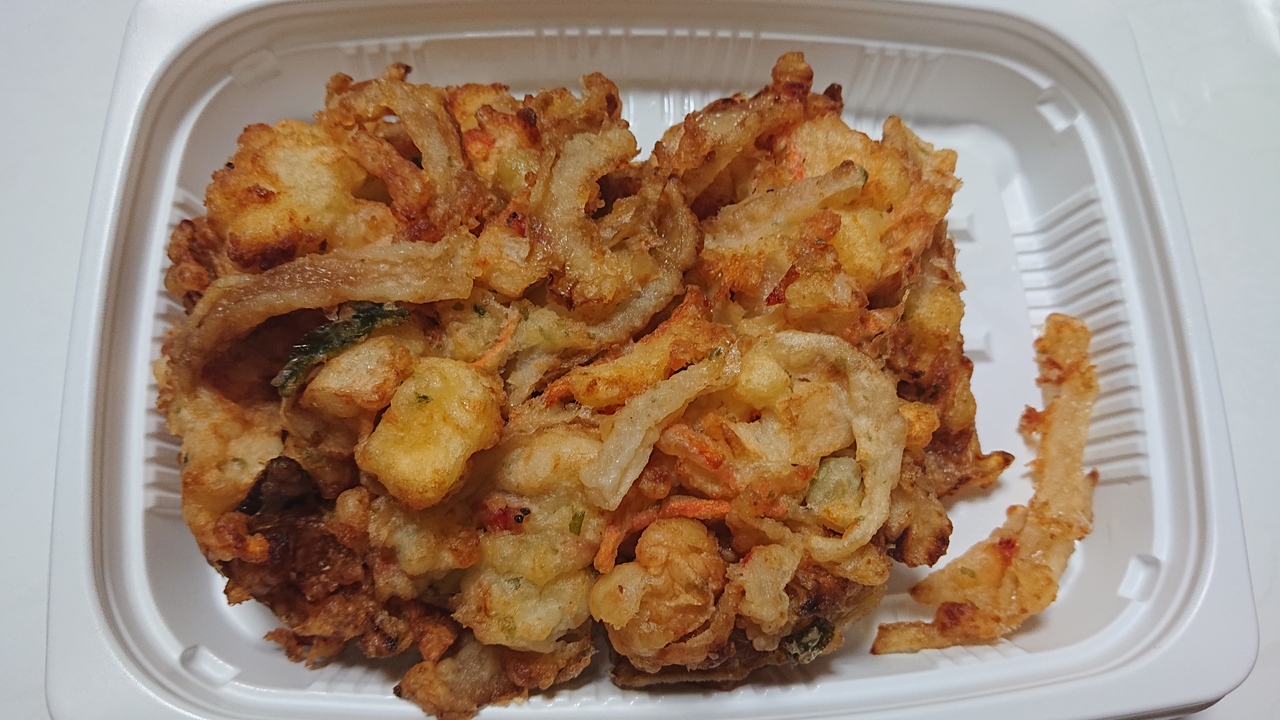 閉店時間近くに訪問。さすがに、品物は残り少なかったですが、その中から数点をチョイスして購入しました。今回印象に残ったのは、かき揚げ。いろいろな野菜が含まれており野菜食べ応えがありましたが、なかでも、タマネギがたっぷりで、その甘みが生かされていると感じました。