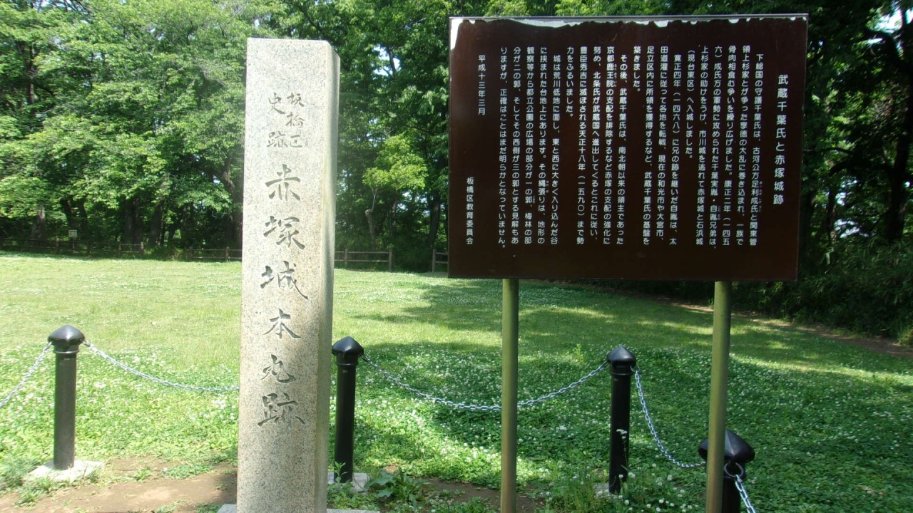 下赤塚駅の北方、赤塚の台地が高島平(徳丸ヶ原)に落ちる崖斜面に、15世紀頃に築かれた城跡が残っている。城址は東京都立赤塚公園の一部として整備されて、池や梅林、桜並木などがある。
