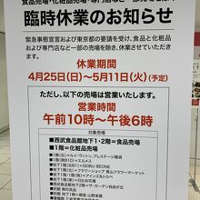 緊急事態宣言および 東京都の要請を受け、食品と化粧品および 専門店など 一部の売り場をから除き、