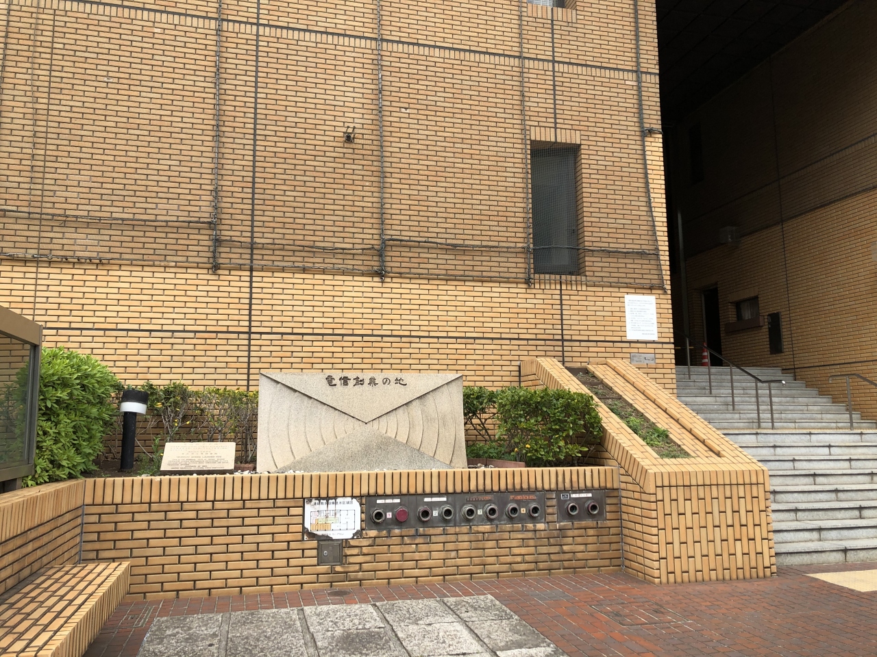 横浜地方検察庁・横浜区検察庁の正面エントランスの横に、「電信創業の地」と記されつぇきひが立てかけられています。左右に電波が飛んでいるようなデザインが施されています。明治2年、この場所にあった横浜電信局と東京電信局との間で、日本で初めて電報の取り扱いが行われたことの記念したもの。
